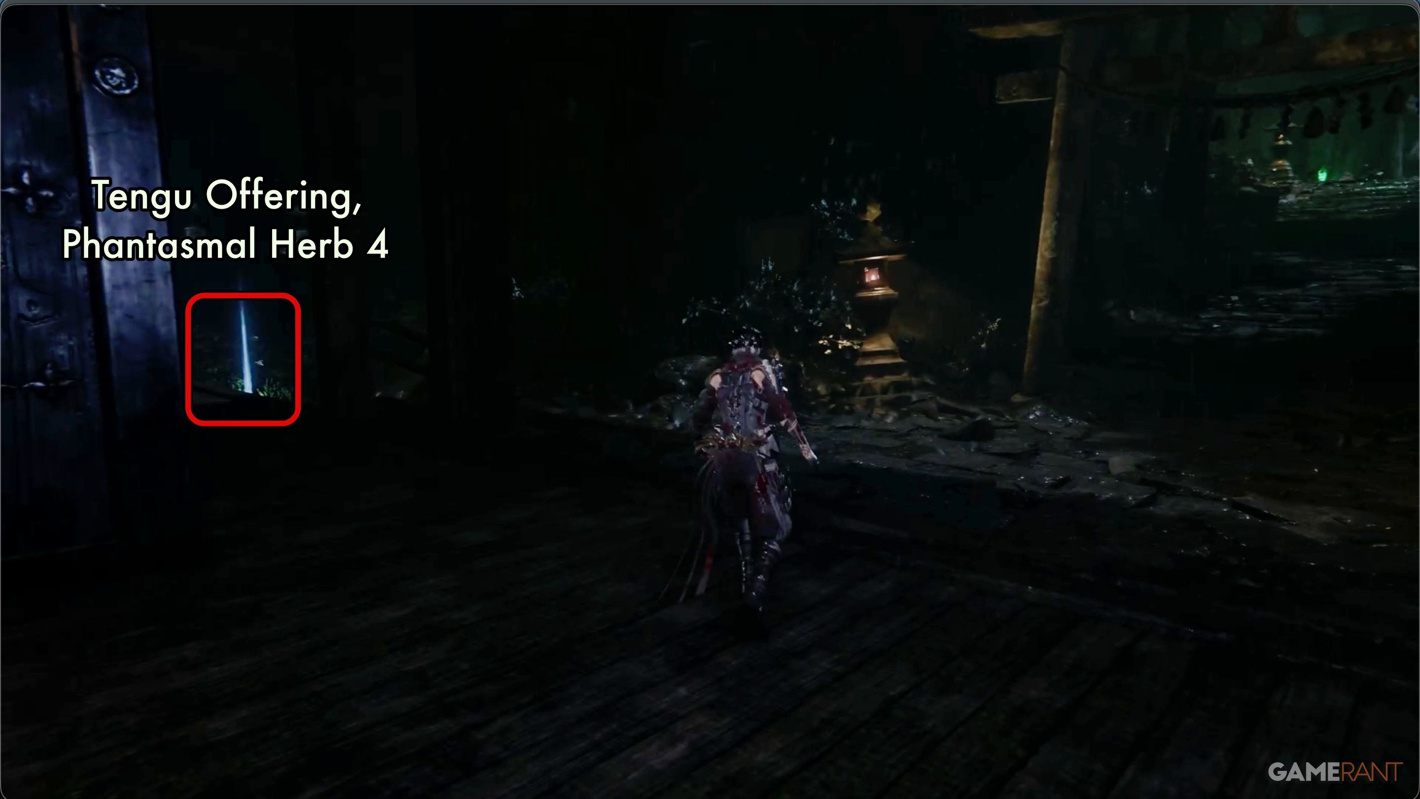 Phantasmal Herb 4 | Chapter 5: Locate and turn in the ‘Tengu Offering’ for the associated mission. You’ll sign up for this mission earlier, but it is completed in Chapter 5. After defeating the statue boss, which looks like the statues you’ve been destroying up to this point, you’ll want to look left as soon as you exit the building. The Tengu Offering will be on the ground. It’s very dark as you exit, so look for the small pillar of light. |