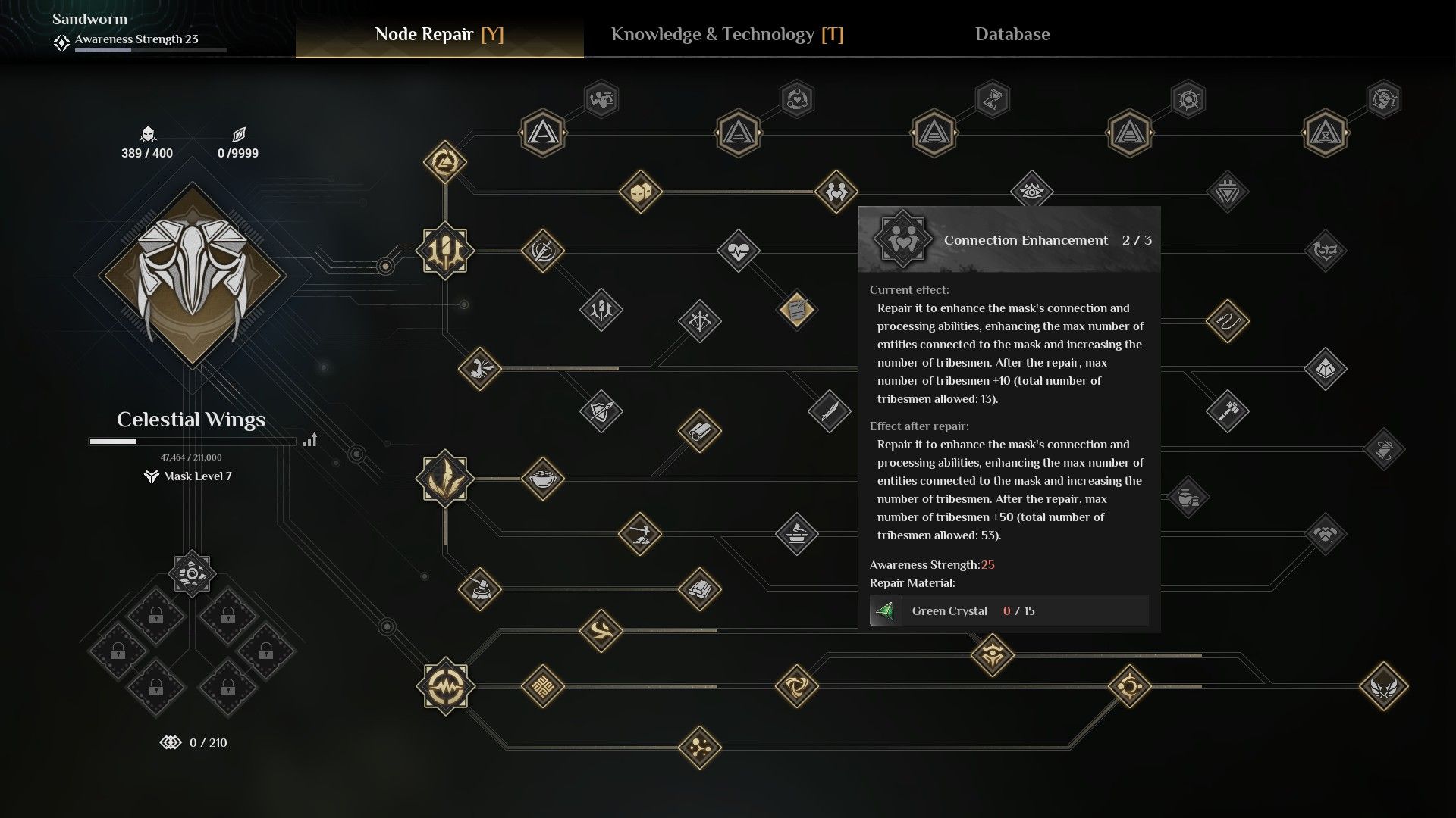 To start, press the ‘Y’ key to access the Mask Node Repair screen. Then, locate the Connection Enhancement node – it’s in the top row, second from the left. You’ll need a lot of Green Crystals to unlock and upgrade it, and you can usually find these crystals in the Ruins scattered throughout the world of Soulmask.
