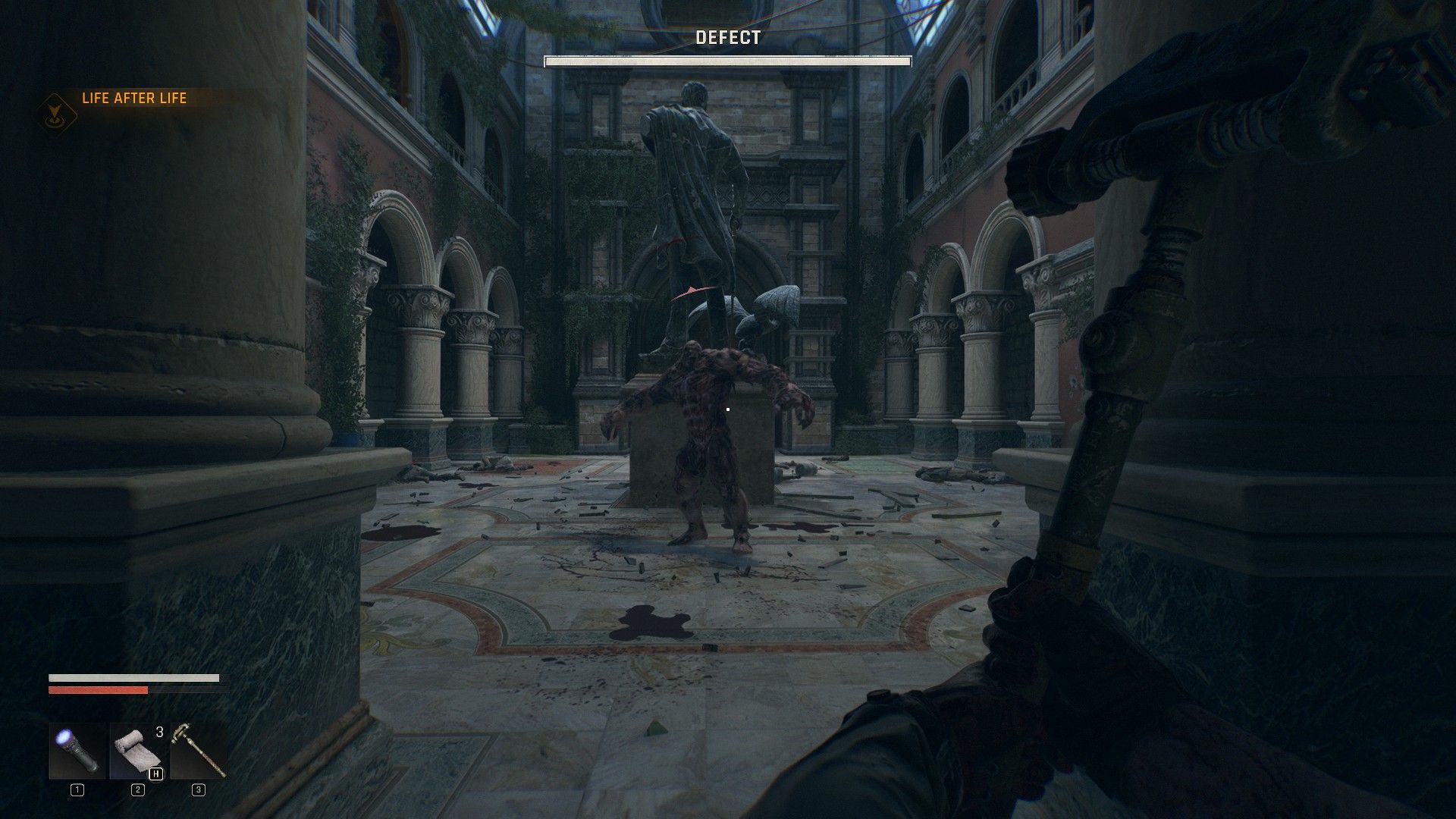 This Chimera relies heavily on powerful slam attacks, so stay aware of your surroundings to avoid them. It’s a very durable enemy, and to save ammo and weapon wear, look for Alcohol bottles in the courtyard and craft Molotov Cocktails. A couple of firebombs will weaken it, after which you can finish it off with melee attacks.