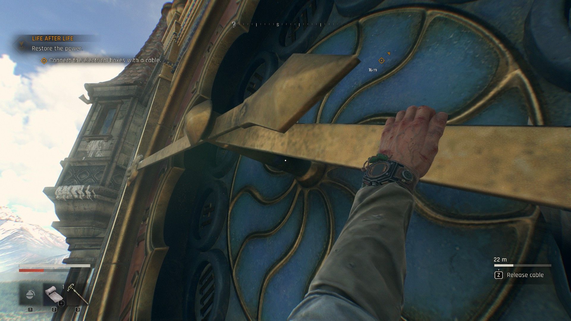 Okay, so I used the zipline to get onto the town hall roof. Then I headed across to the power room, which is way on the other side of the tower. Inside, I found this junction box and had to run a really long power line from it back to the tower itself. After messing with the box, I squeezed through this tiny vent in the room. That led me down to the base of the tower, and then I had to climb all the way back up… but this time through the clock face! It was a bit of a climb, but I made it.