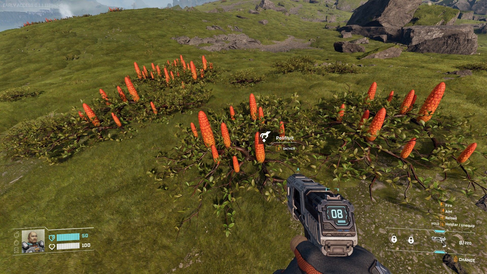 At the beginning of the game, you’ll find food by gathering plants, and they’re pretty common. Right after you leave your ship, look for a pond with some flowering plants around it. The plants you want are called Polifruits – they look similar to corn or carrots.