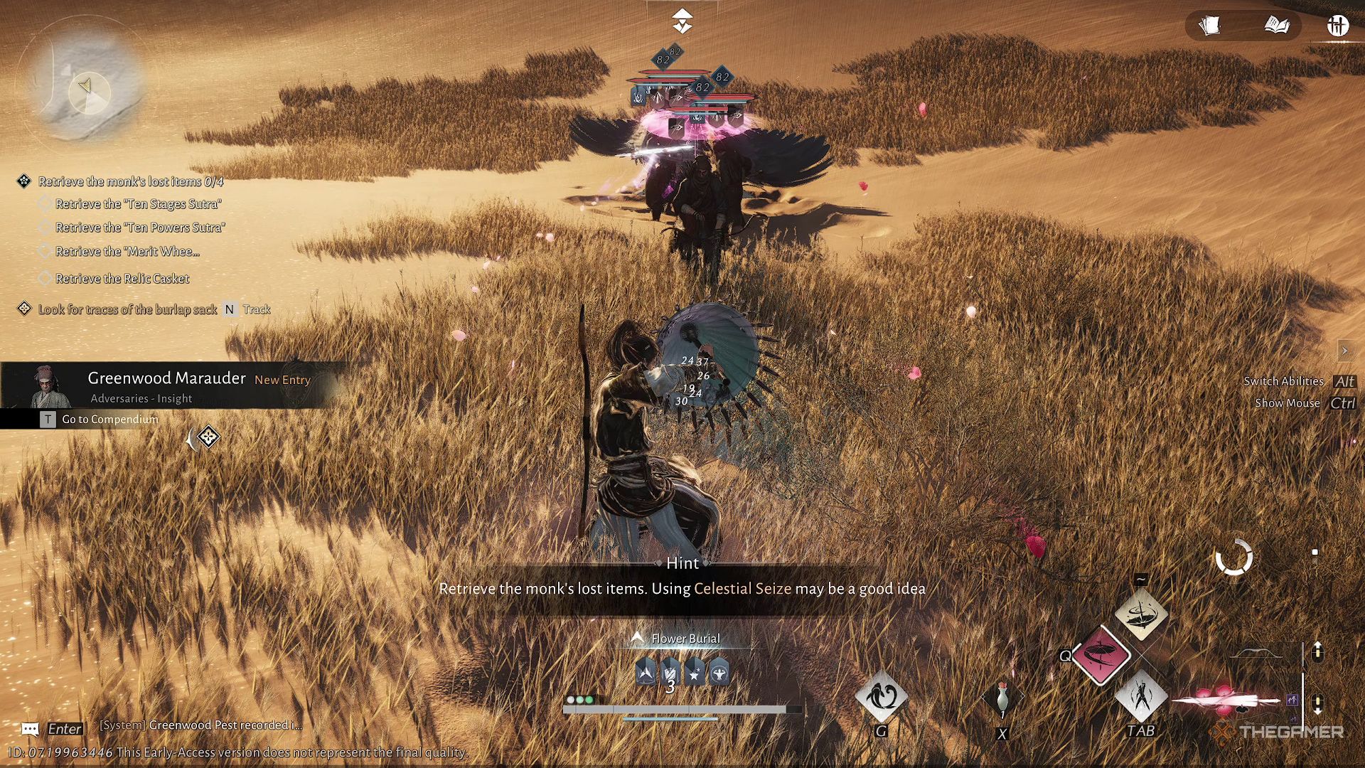 Head south, following the tracks, and use Wind Sense to stay on course. You can either use Celestial Sieze to get the monk’s belongings, or fight and defeat the bandits, then search near the monk’s white horse to find them. Once you have the items, bring them back to the monk.