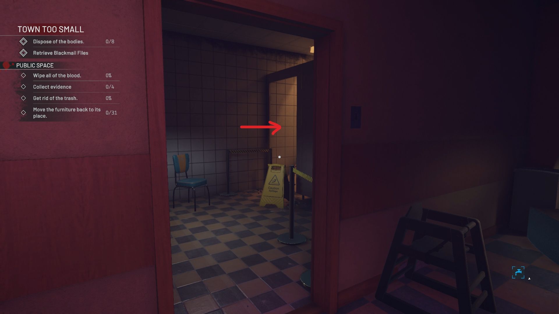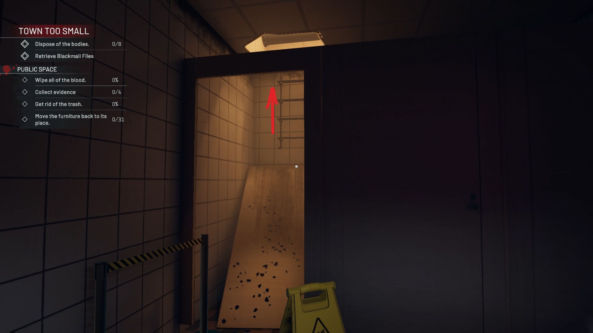 If you check the bathroom, you’ll see that one of the stalls has a broken door, and it’s closed off with a yellow sign.