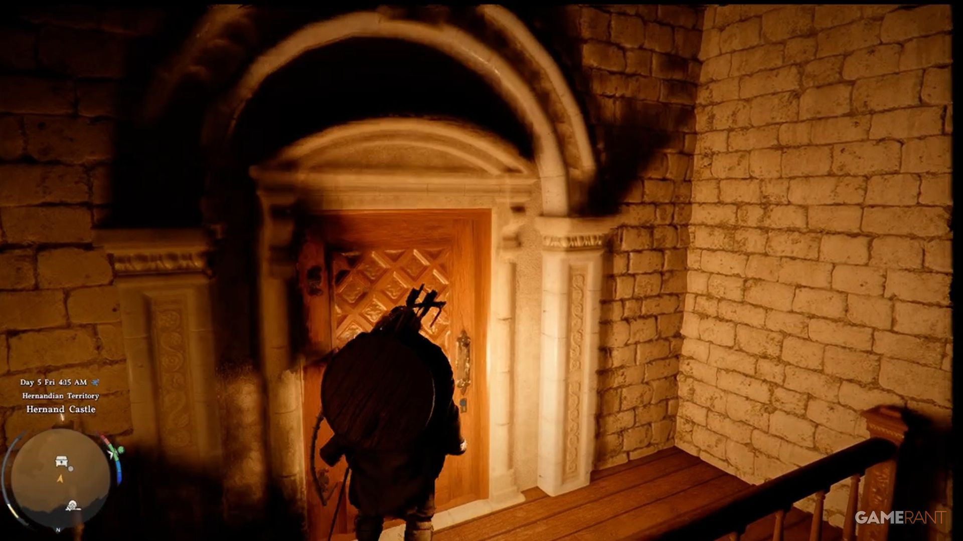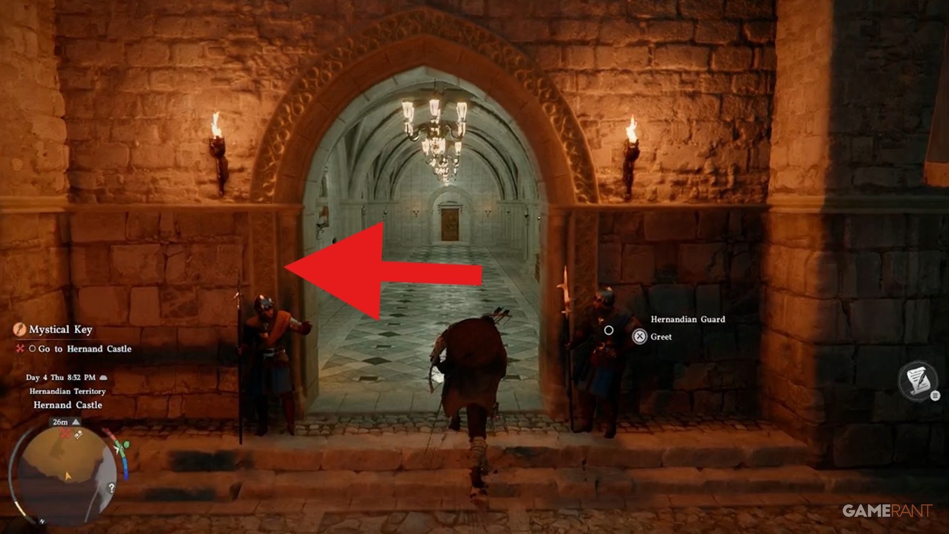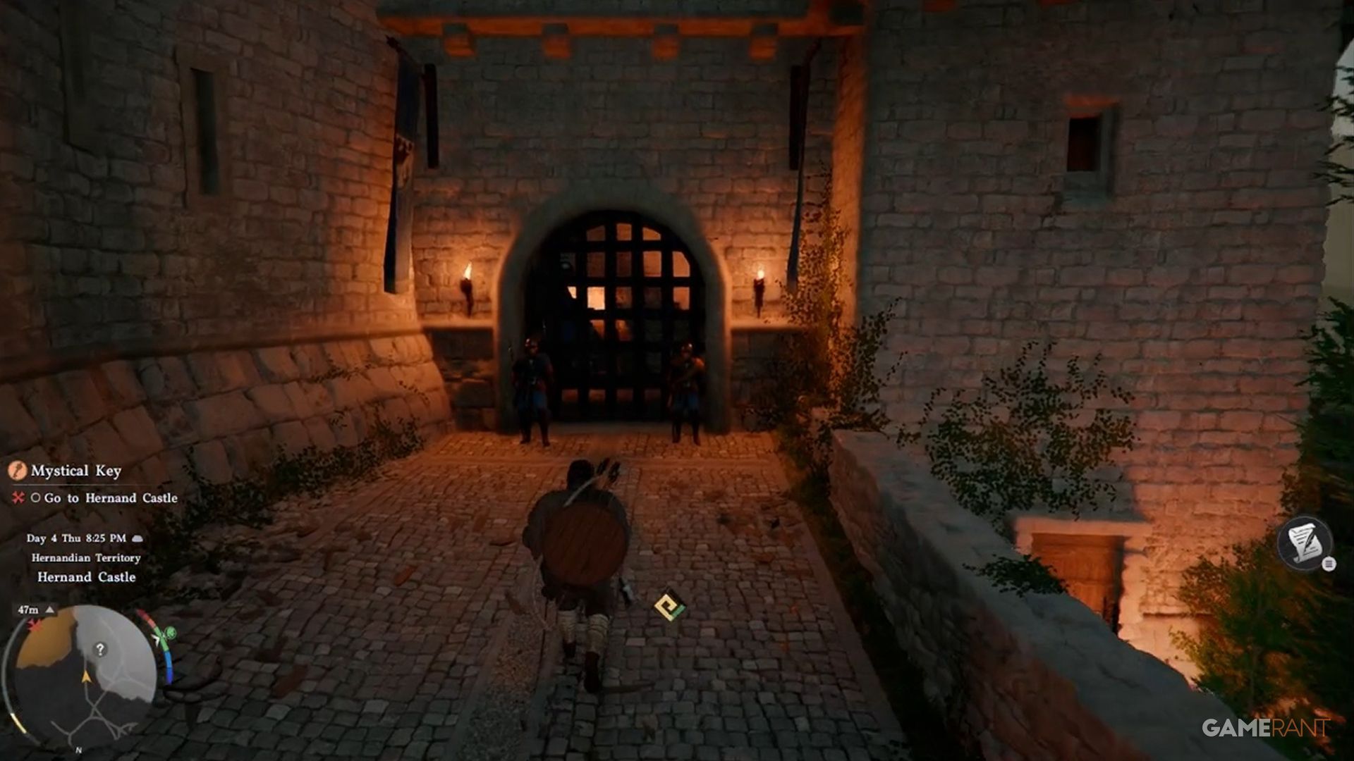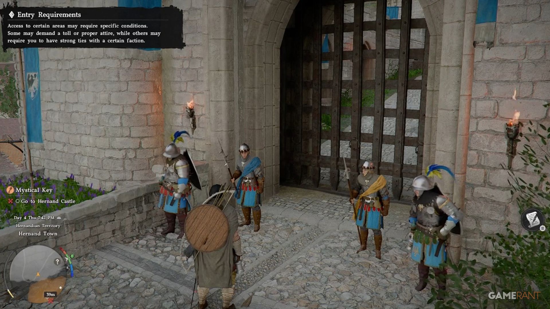 To find the Hernand Castle Strongbox, you first need to get inside the castle grounds. The guards at the main gate require you to be wearing Hernandian Attire before they’ll let you pass. You can get this outfit by completing the ‘Actions Speak Louder than Words’ quest. Once you’re dressed appropriately, the guards will allow you entry. While it’s possible to climb the walls to sneak in, it’s generally better to follow the rules.