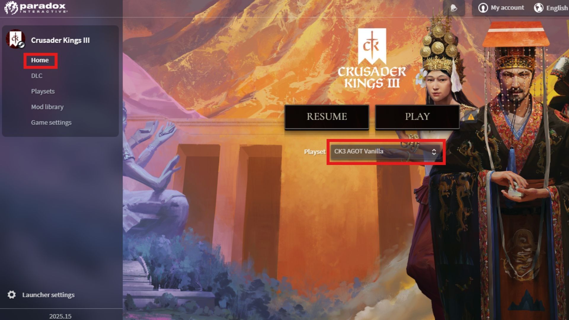 Once you’ve subscribed to the mod, start CK3 to open the game launcher. Before you begin playing, click on “Playsets” in the menu on the left. Then, create a new playset, add the mod to it, and choose “A Game of Thrones”.