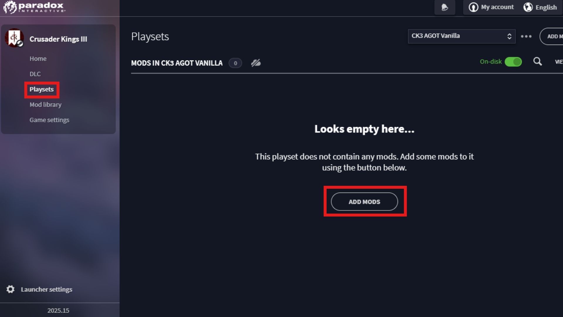 Once you’ve subscribed to the mod, start CK3 to open the game launcher. Before you begin playing, click on “Playsets” in the menu on the left. Then, create a new playset, add the mod to it, and choose “A Game of Thrones”.