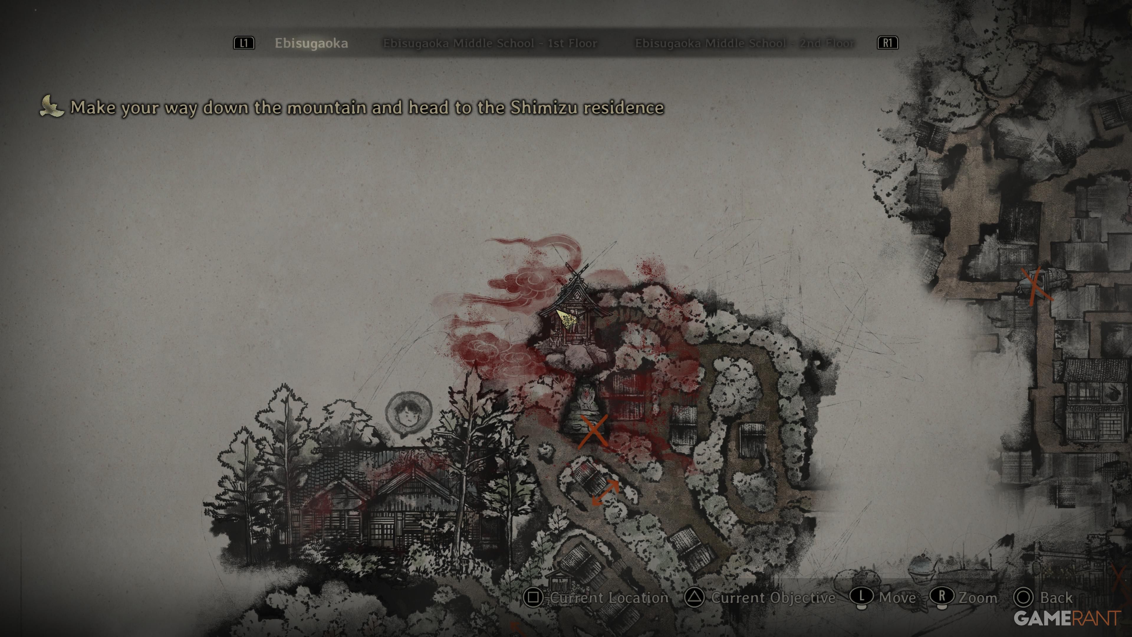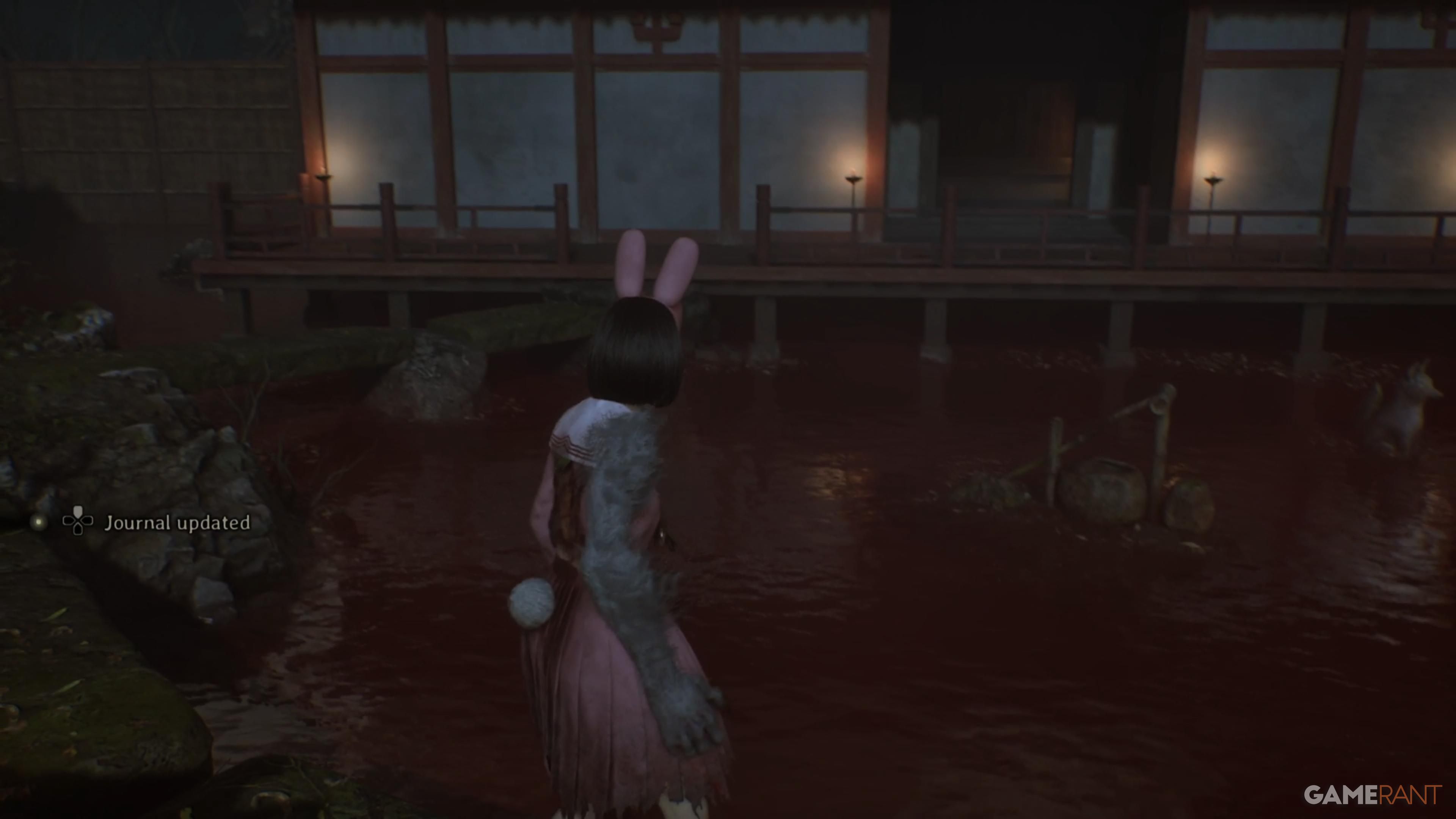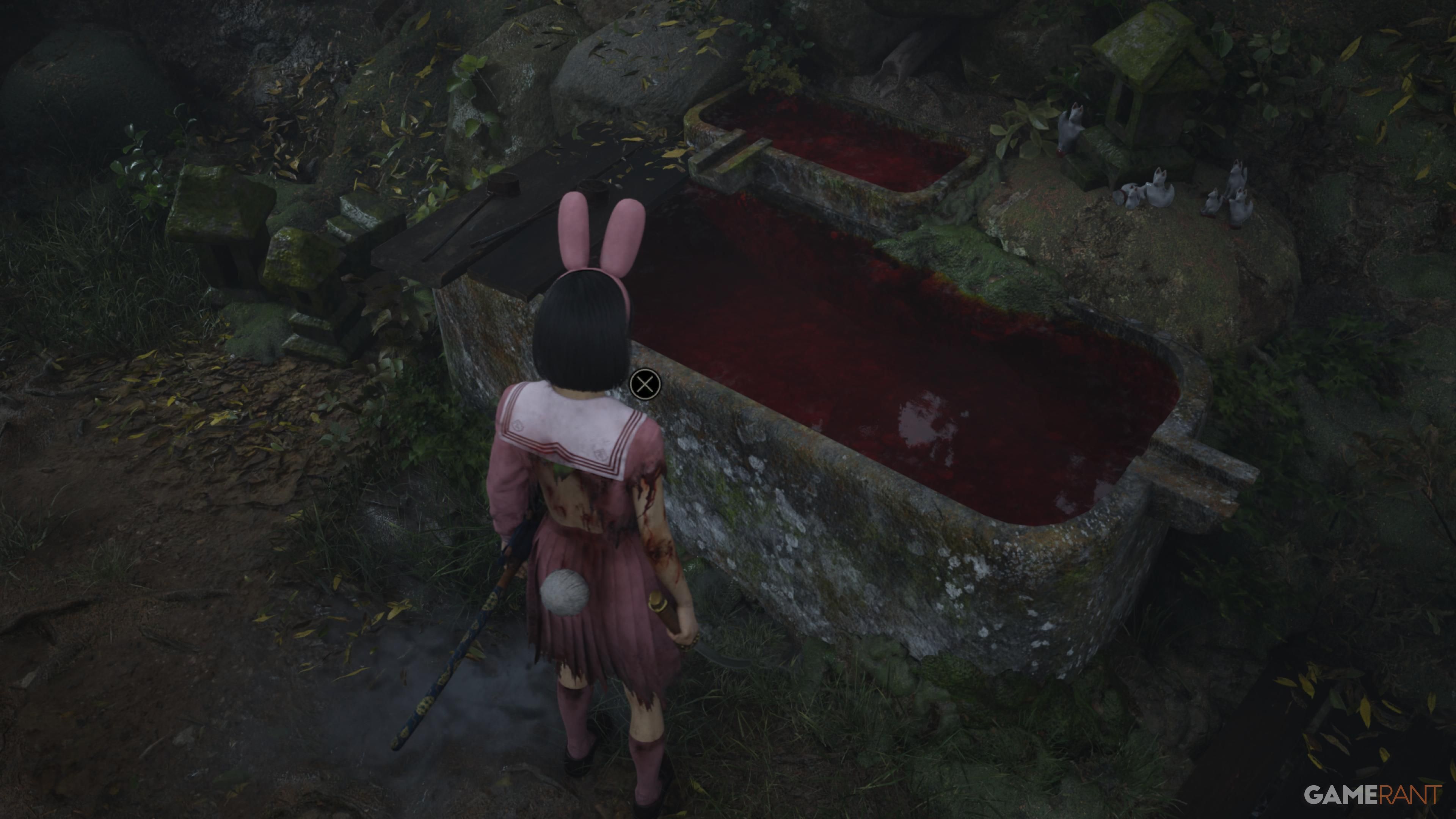 After obtaining the Sacred Sword and solving the Crimson Water Puzzle, you’ll be able to finish the Main Hall chapter. This will return you to the front of Shu’s house, allowing you to continue on to Ebisugaoka. After fighting several enemies-some of whom will try to stop you-you will come to a split: the main route continues to the right, and a path on the left, which takes you up the stairs to a small shrine. At the shrine, you’ll discover a stone basin filled with the same red water featured in the Heritage of Crimson Water.
