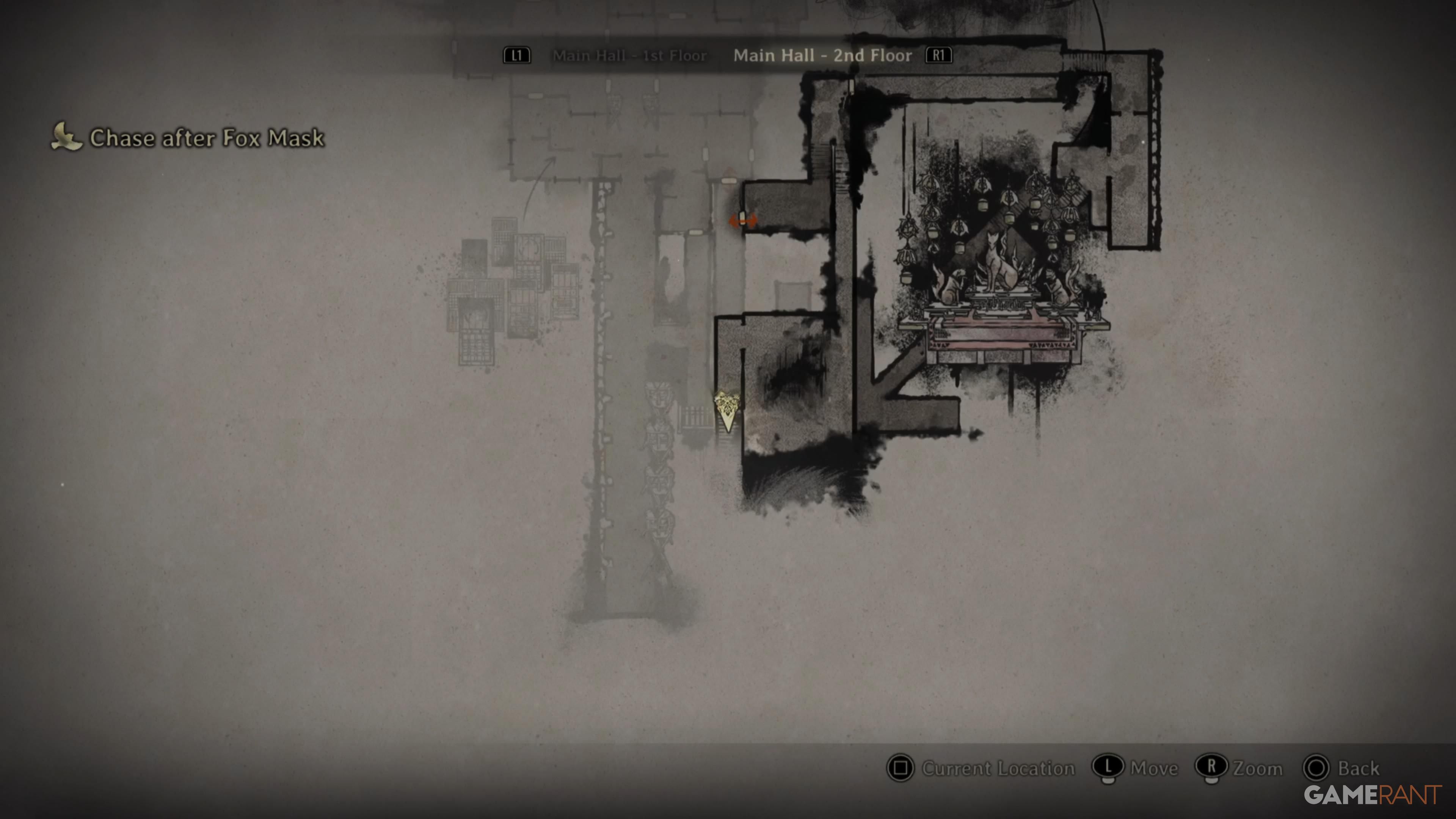 Okay, so if you want to get to this puzzle, you’ll first need to play through the story again on New Game Plus until you get to the Main Hall. Normally, you’d have to do those three rituals from the original game, but since I already got the fox arm and its powers, I can pretty much skip that whole chapter! Before I do that though, I need to head to the southeast side of the map, where there’s a door I can open to go upstairs and reach the upper area. The floor up there is all broken, so I’ll have to walk around the room to get to the other side.