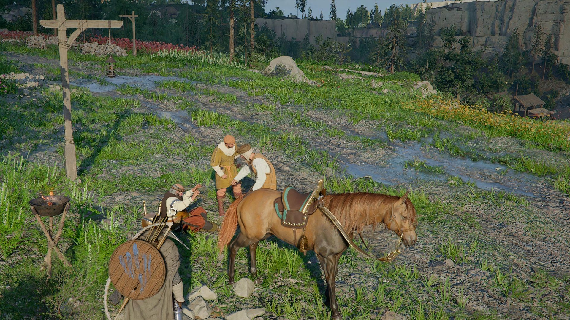 Just follow the marker until you reach a road with the guards stationed there. Talk to them and tell them what you’ve found out. This conversation will reveal that Hornsplitter and his crew are the most likely culprits behind the recent problems.