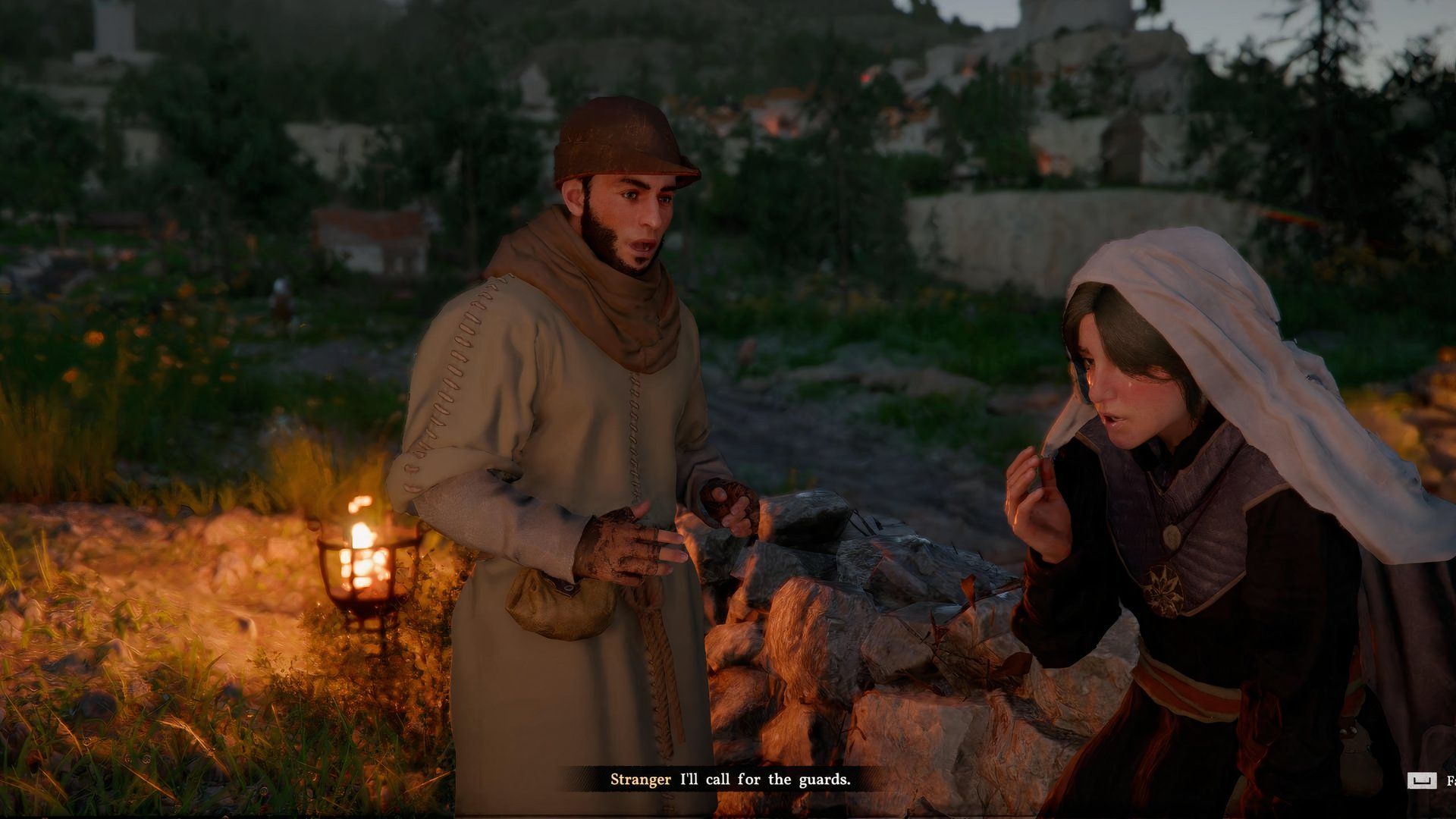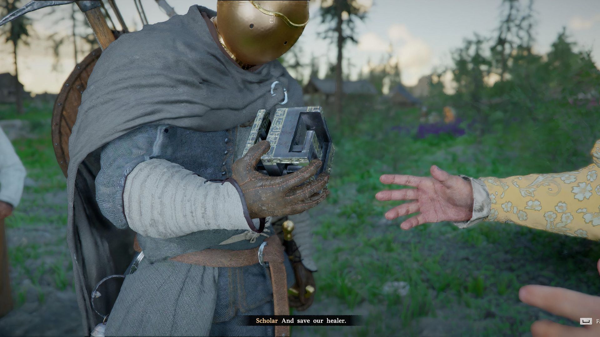 After talking to her, you learn a healer is in trouble. He wouldn’t side with the Goldleaf group, so bandits burned down his house, and someone is still inside. The situation is urgent, and the game wants you to help immediately.