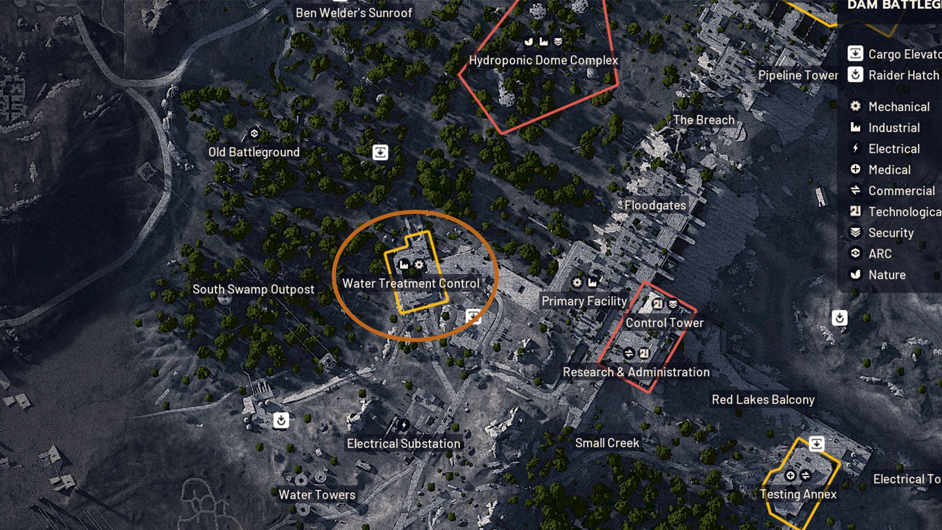 Begin at the Dam Battlegrounds and head towards the Water Treatment Control building. You’ll find it between the Primary Facility and South Swamp Outpost, directly under the Hydroponic Dome Complex on the map. Once inside, go to the end of the hallway โ you’ll need a Dam Surveillance Key to unlock the door there.