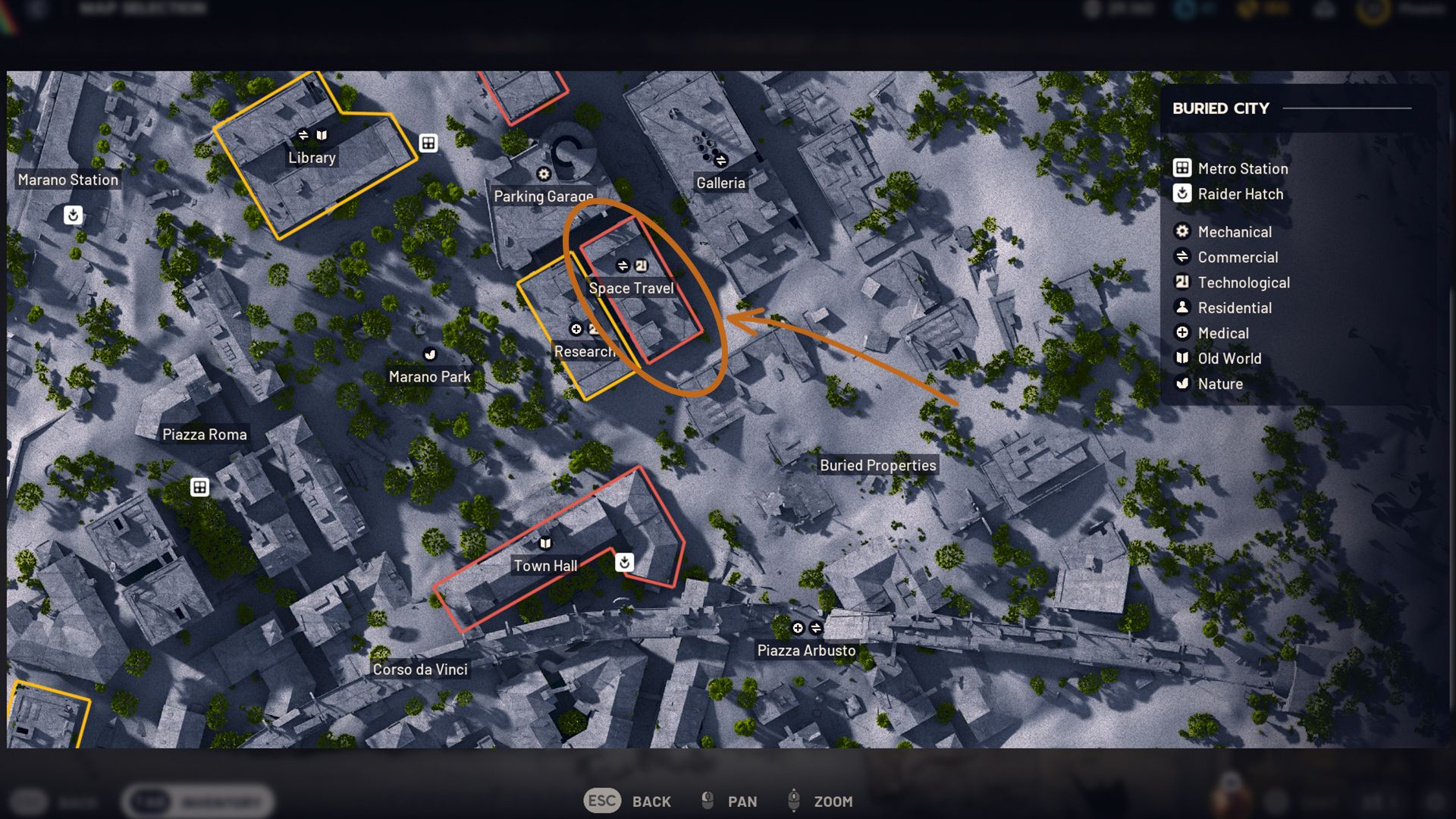 Finally, head to the Space Travel building in the Buried City. It’s located right beside the Research building, near Marano Park, and between the Town Hall and the Library โ it’s a great place to find valuable loot.