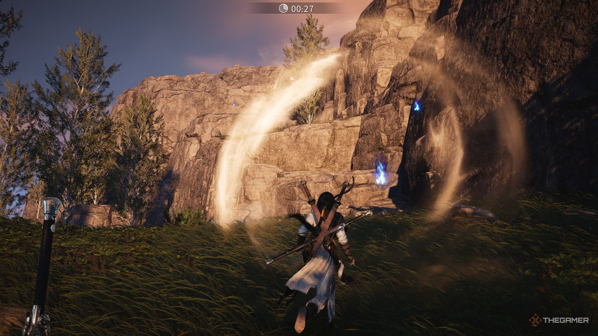 South of the Desperation Ridge Boundary Stone near the edge of the map. | Run through the fiery blue wisps to collect them within the timeframe. | Use Wallstride to help collect the wisps. |