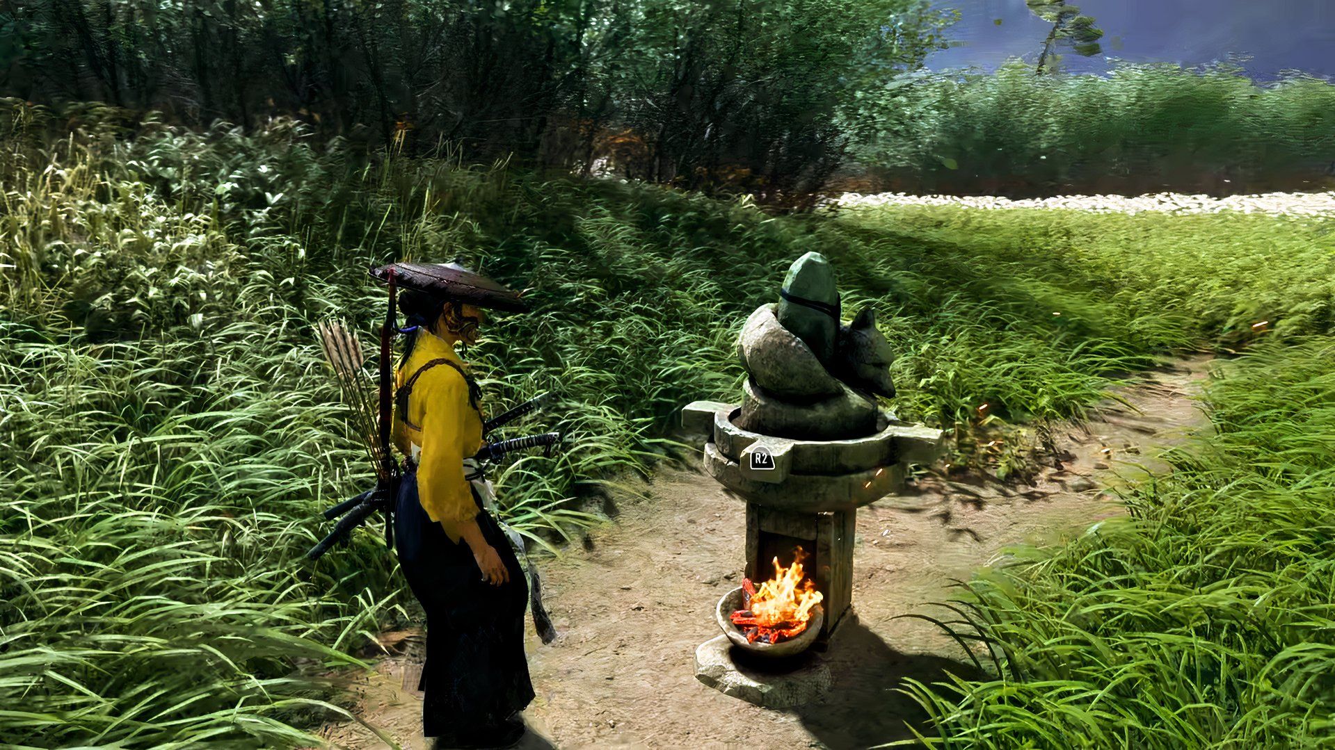 You’ll find the Reliquary of Courage in the Yotei Grasslands, located west of the Nupur River and east of Jade Grove. Take a look at the screenshot above to help you find the precise spot. As you get closer, a golden bird will appear and guide you through the tall bamboo to the statue at the center.