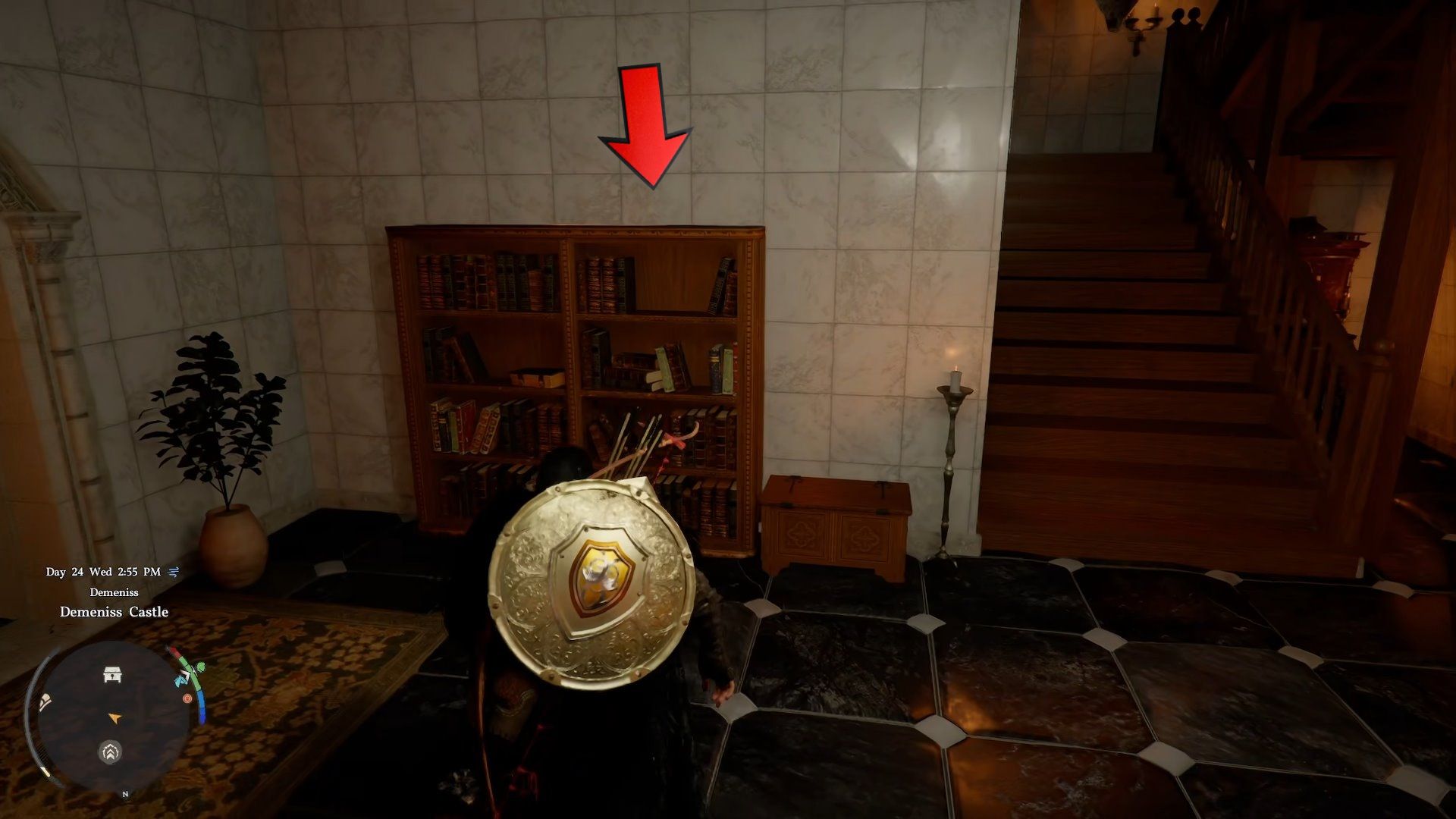 5. Push against the bookcase to rotate it and enter the hidden room containing the Demeniss Castle Strongbox puzzle.