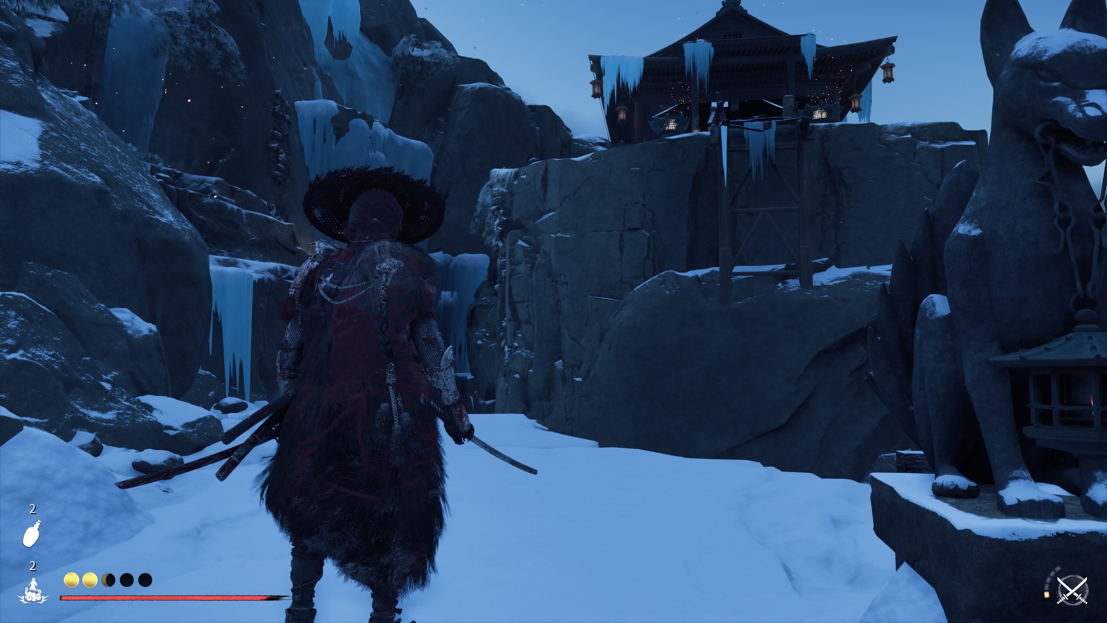 This will trigger a series of platforms you can cross to get to the next section. Now, ensure the lone fox statue is facing left to activate additional platforms, allowing you to climb through and reach the Snow’s Blight Hideout. This hideout functions as a Yotei Six Camp and is filled with shinobi enemies; you must defeat them all to continue. Once they’re all eliminated, proceed to the main courtyard to challenge the area’s boss. Defeating him will open the way to the left, where you’ll find the Altar to earn a new skill point and fully clear out the hideout.