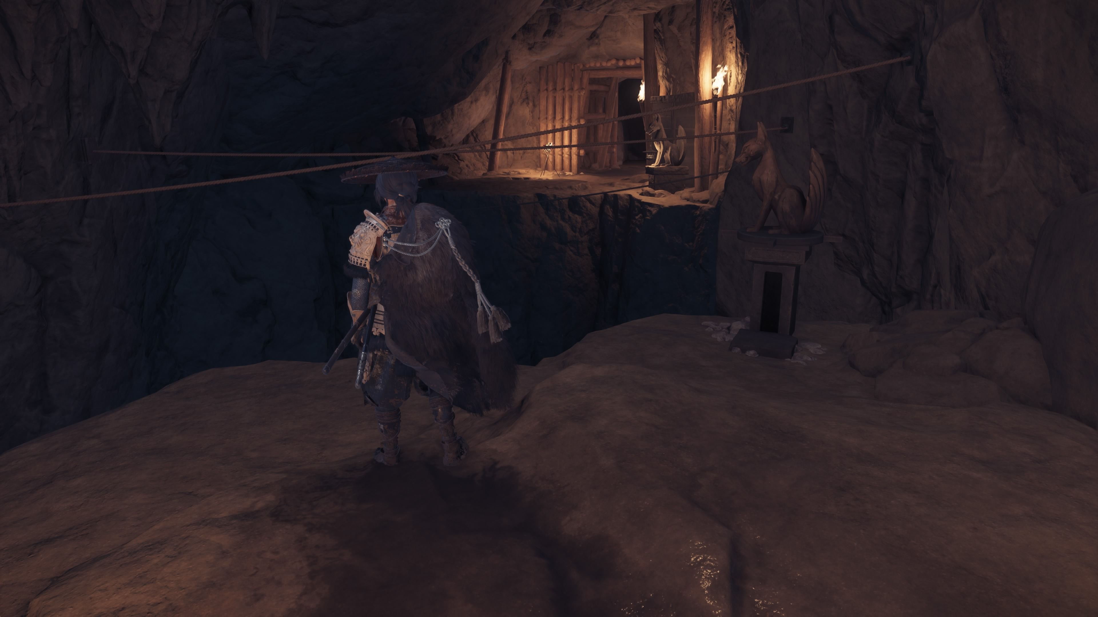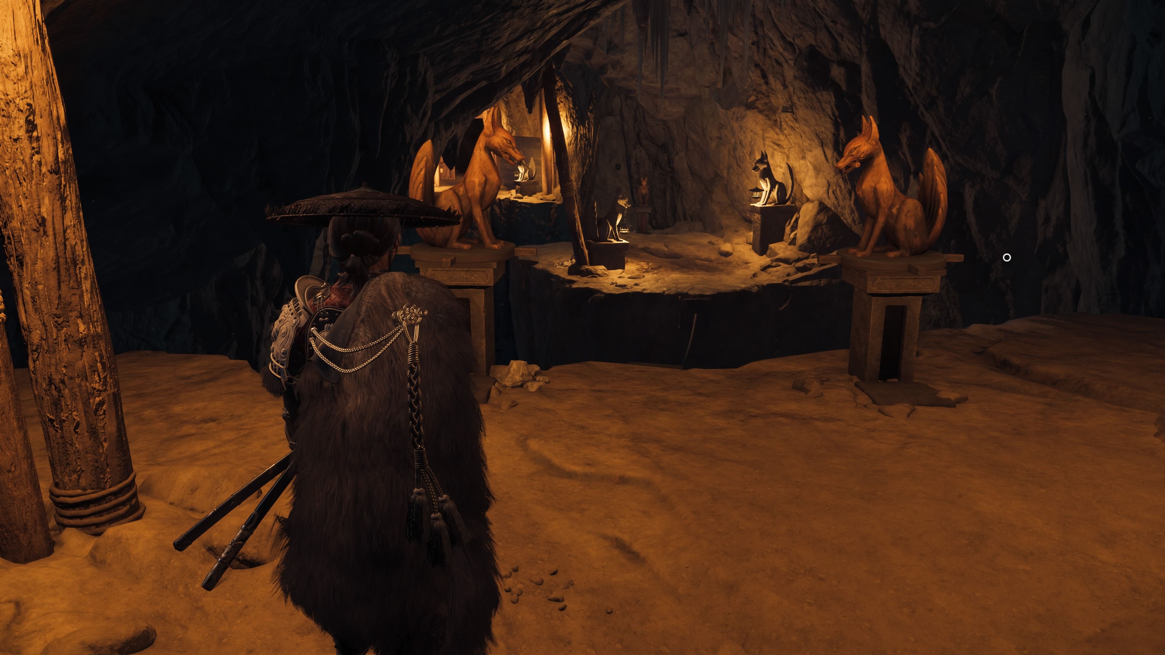 Enter the cave, and you’ll soon encounter a sharp drop and a cliff face that appears impassable. The solution is simple: reposition the fox statues into their designated spots: