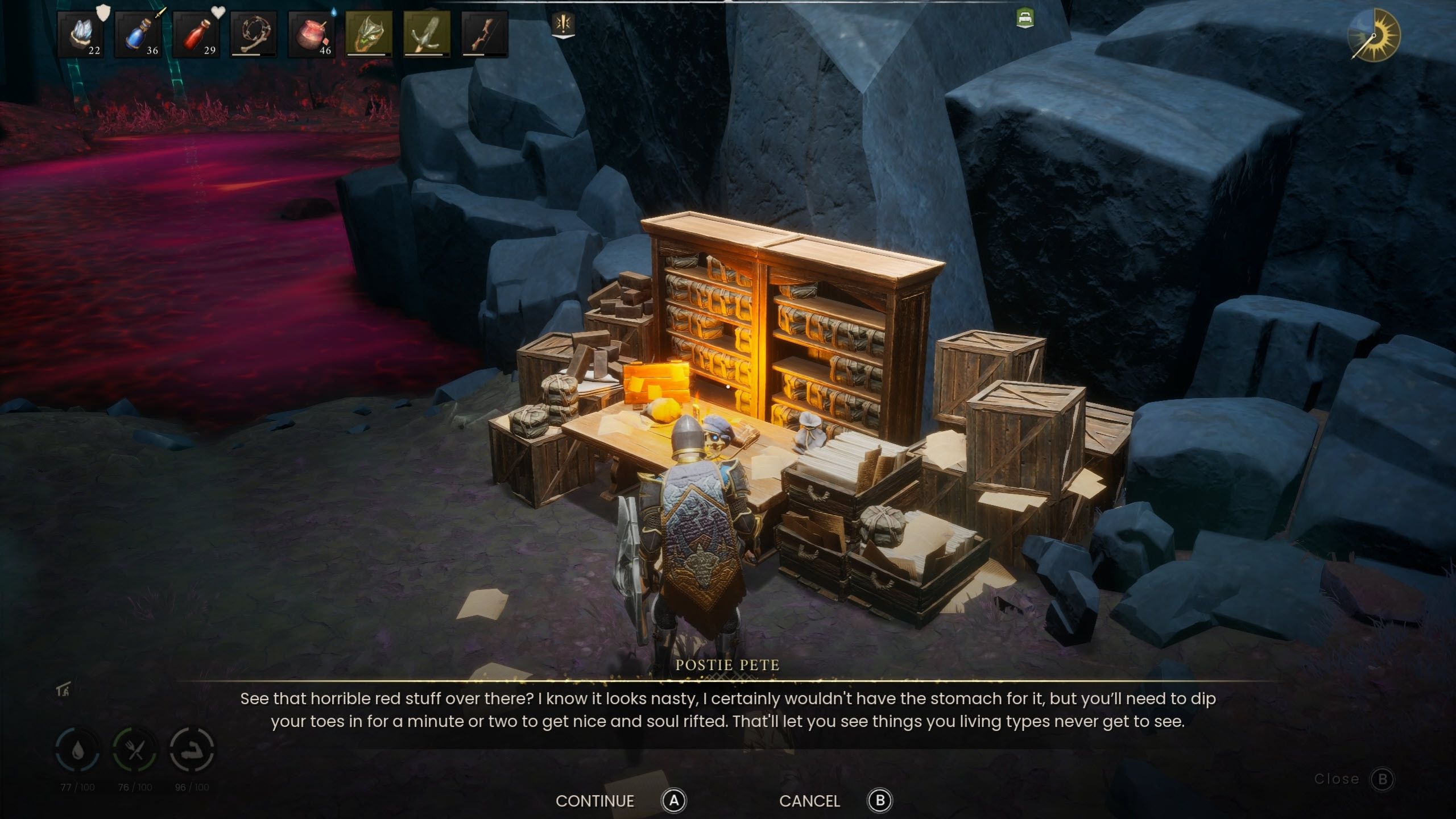 Once you’ve finished talking, go to the path on the right to find Postie Pete, a floating skull you’ll see sitting at a table.