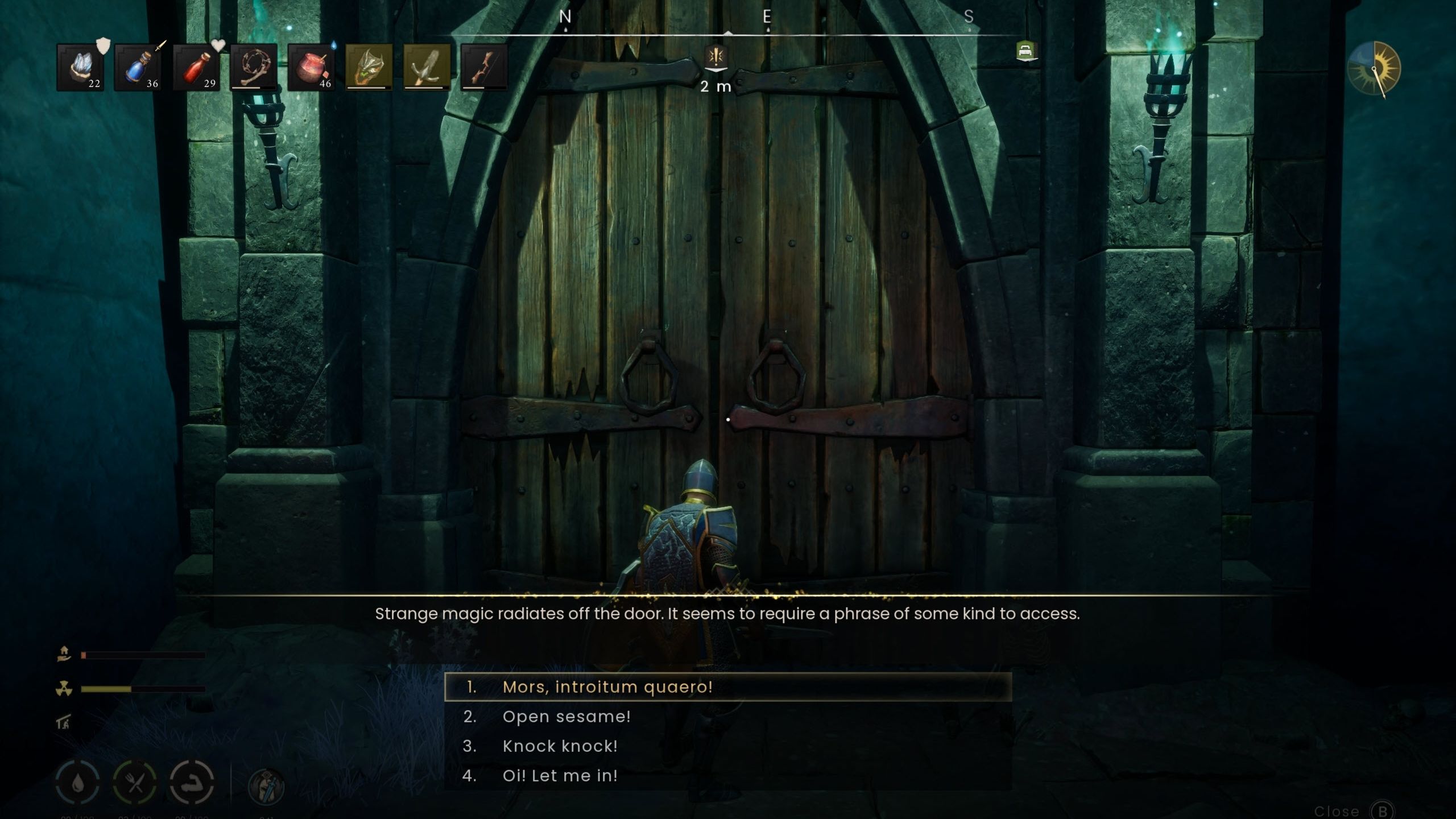 Once you’ve approached the door, say “Mors, Introitum Quaero!“. This will open the door and transport you to the beginning of Fellhollow.