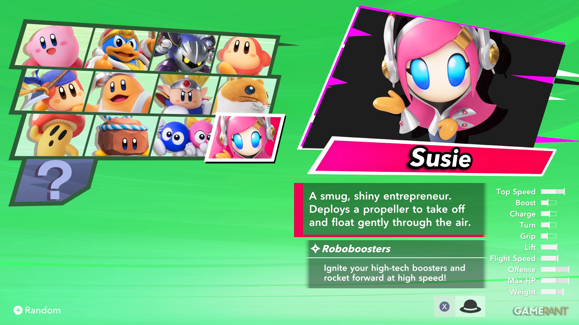 You can unlock Susie in Kirby Air Riders by hitting three enemies with one attack while playing Road Trip mode. Alternatively, you can unlock her by landing perfectly five times during a single Air Ride race.