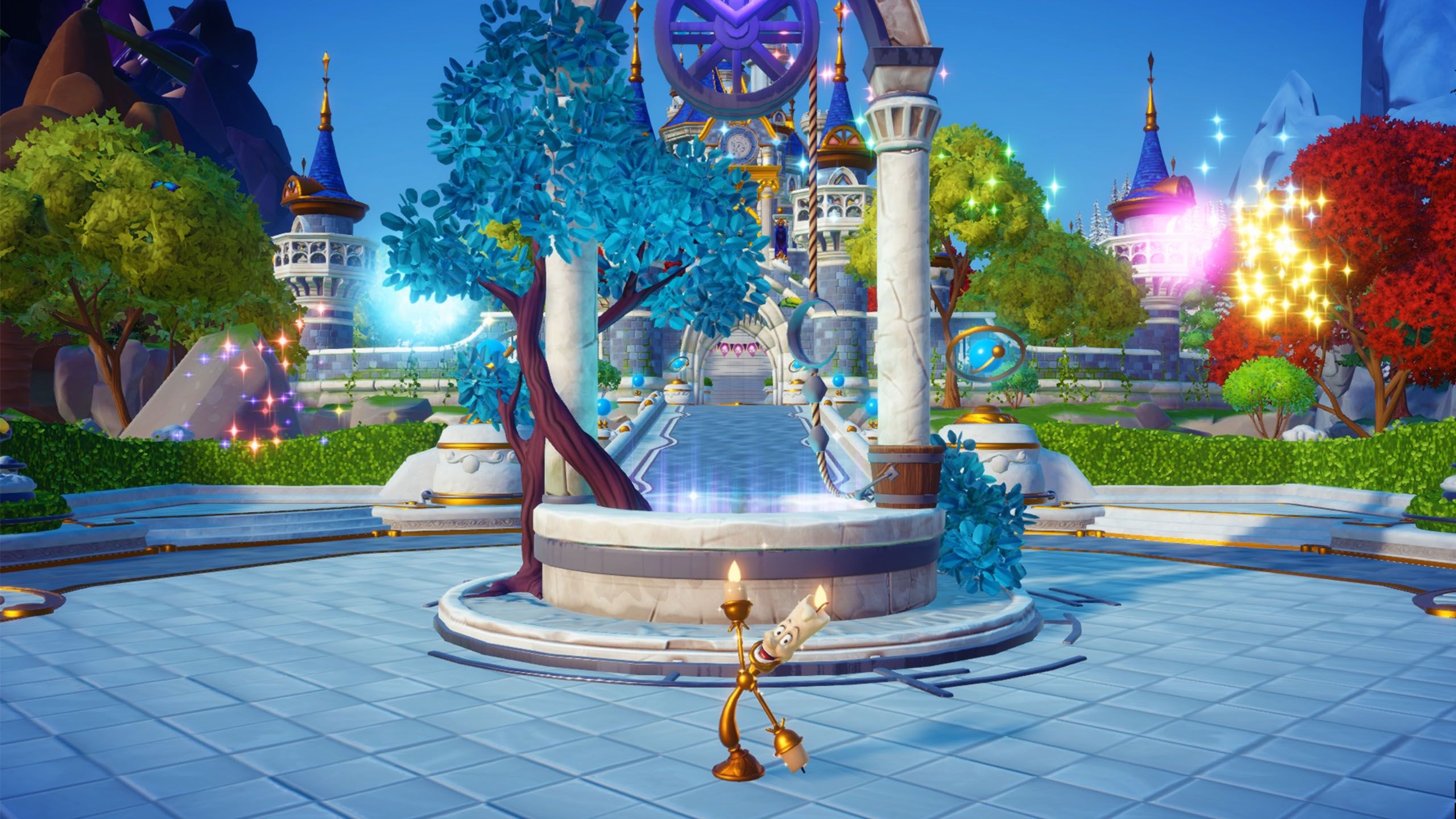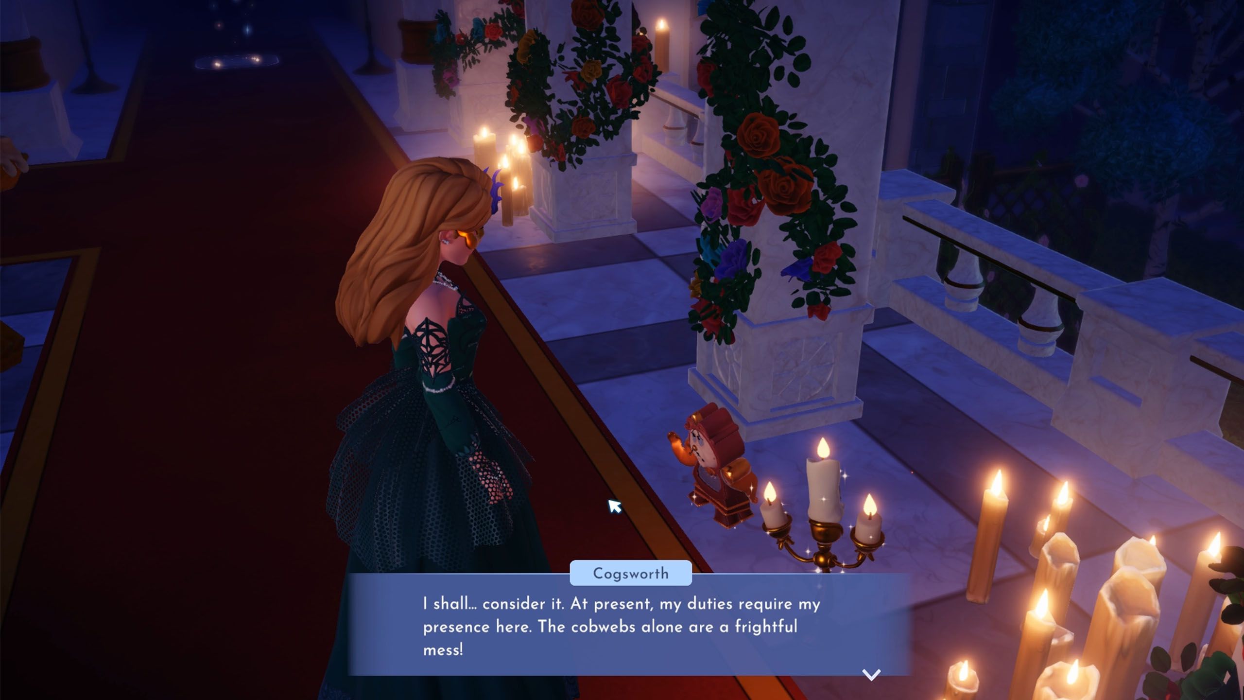 Okay, so I need to head back to the DDV world of Beauty and the Beast. I’ve gotta finish up talking to Belle and the Beast – one last time, apparently – and then complete the “A Guide To Better Castle-Keeping” quest. That’s how I unlock Cogsworth! Let’s get it done.