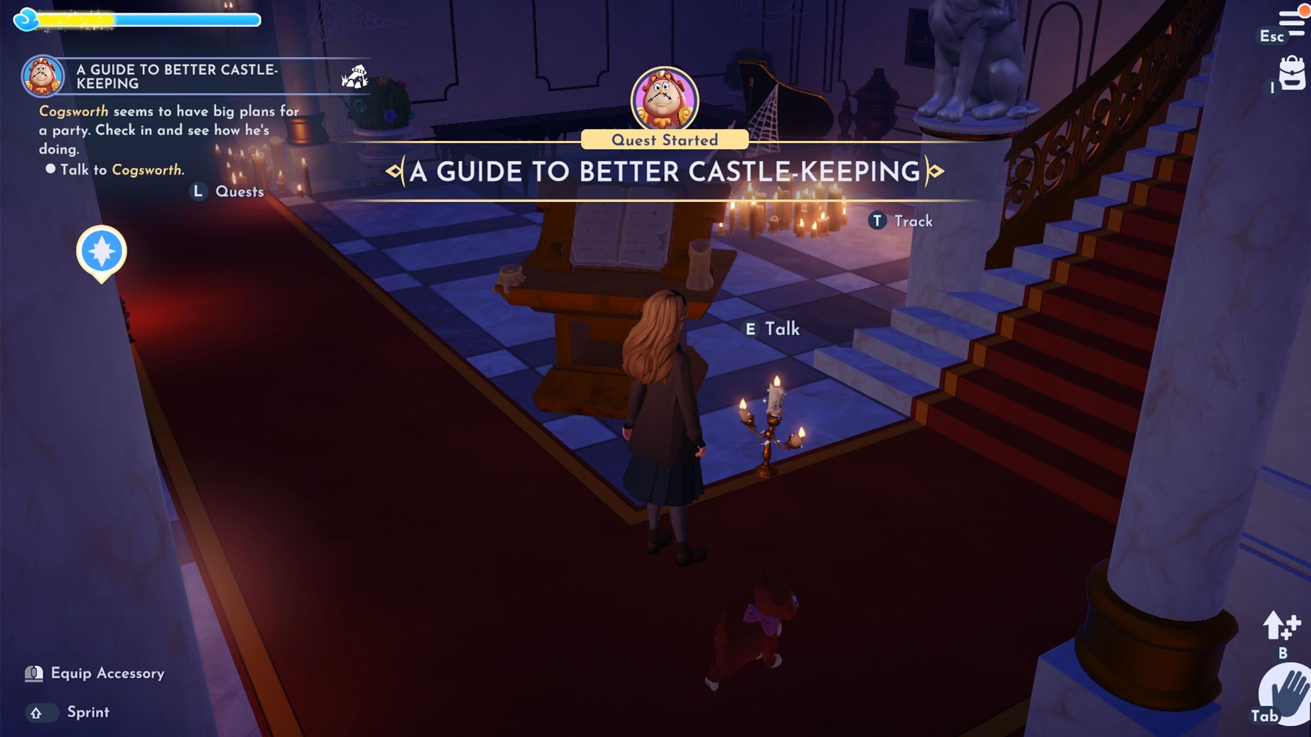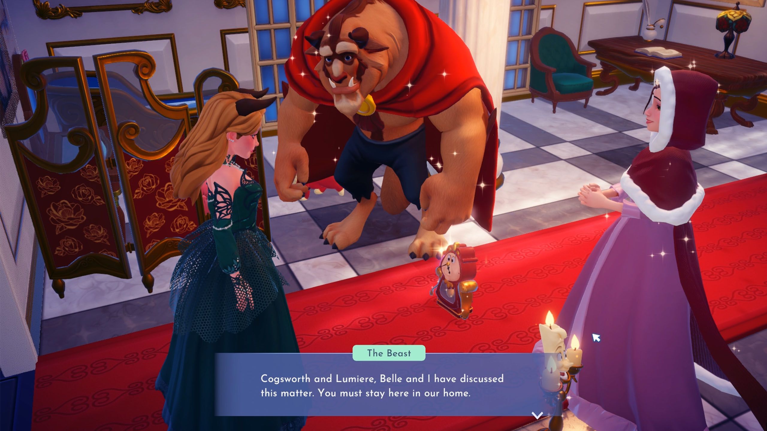 Okay, so I need to head back to the DDV world of Beauty and the Beast. I’ve gotta finish up talking to Belle and the Beast – one last time, apparently – and then complete the “A Guide To Better Castle-Keeping” quest. That’s how I unlock Cogsworth! Let’s get it done.