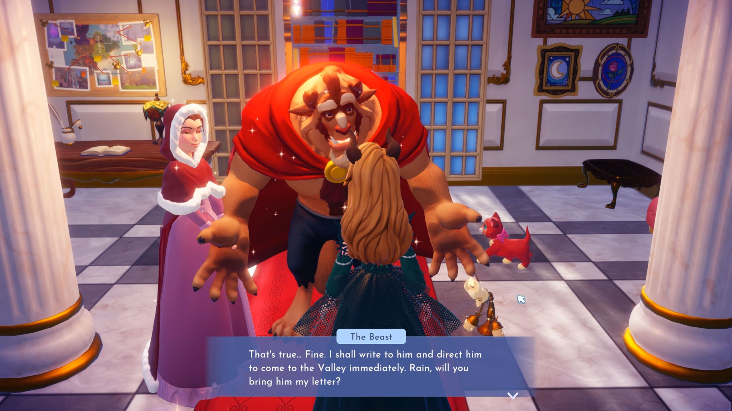 Now, you need to ask the characters to come to the valley, but only Lumiere agrees – Cogsworth wants to remain at the castle to look after things. Once Lumiere arrives, speak with Belle and the Beast. The Beast will then give you a letter for Cogsworth, requesting that he join you in Dreamlight Valley.