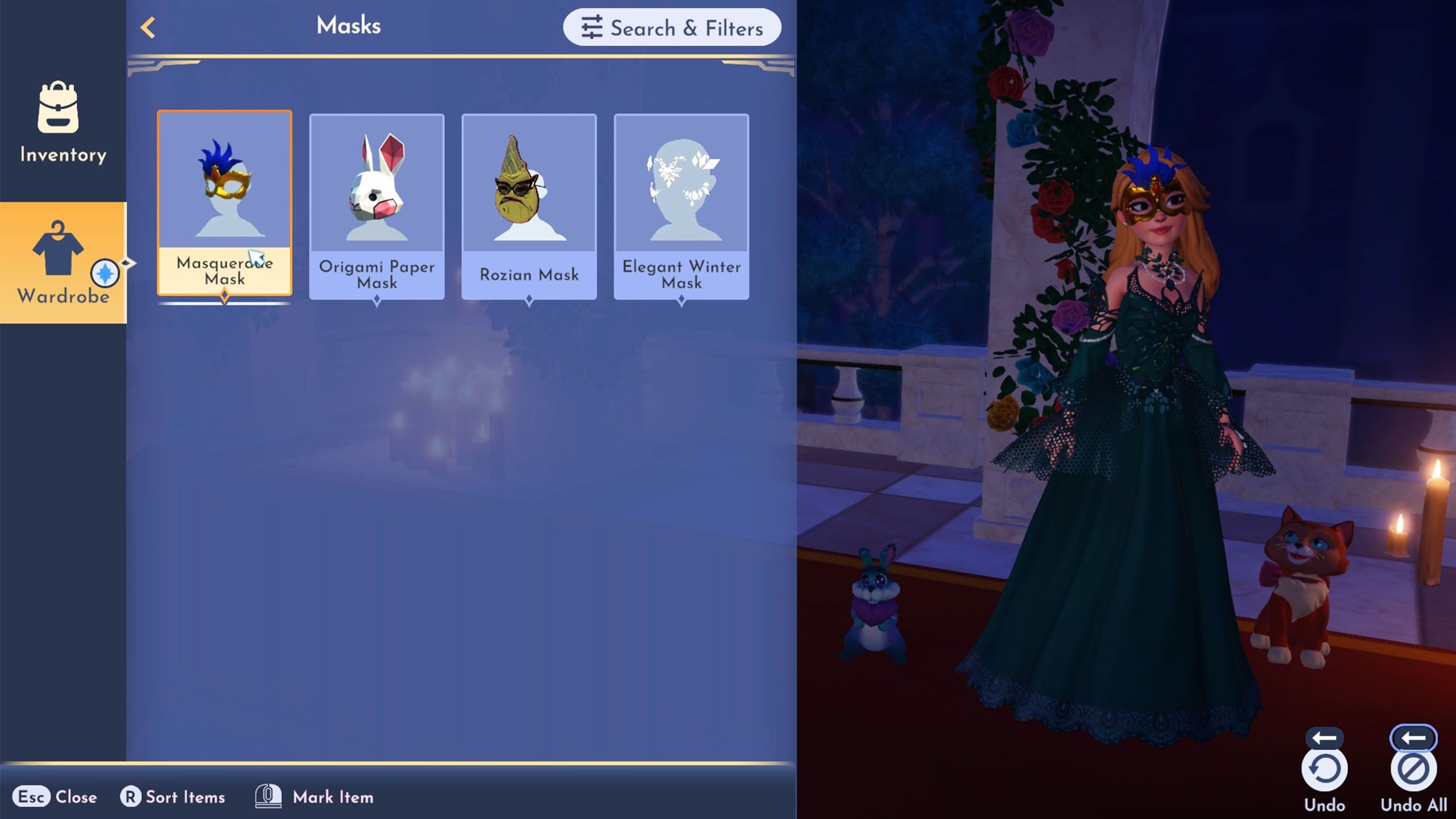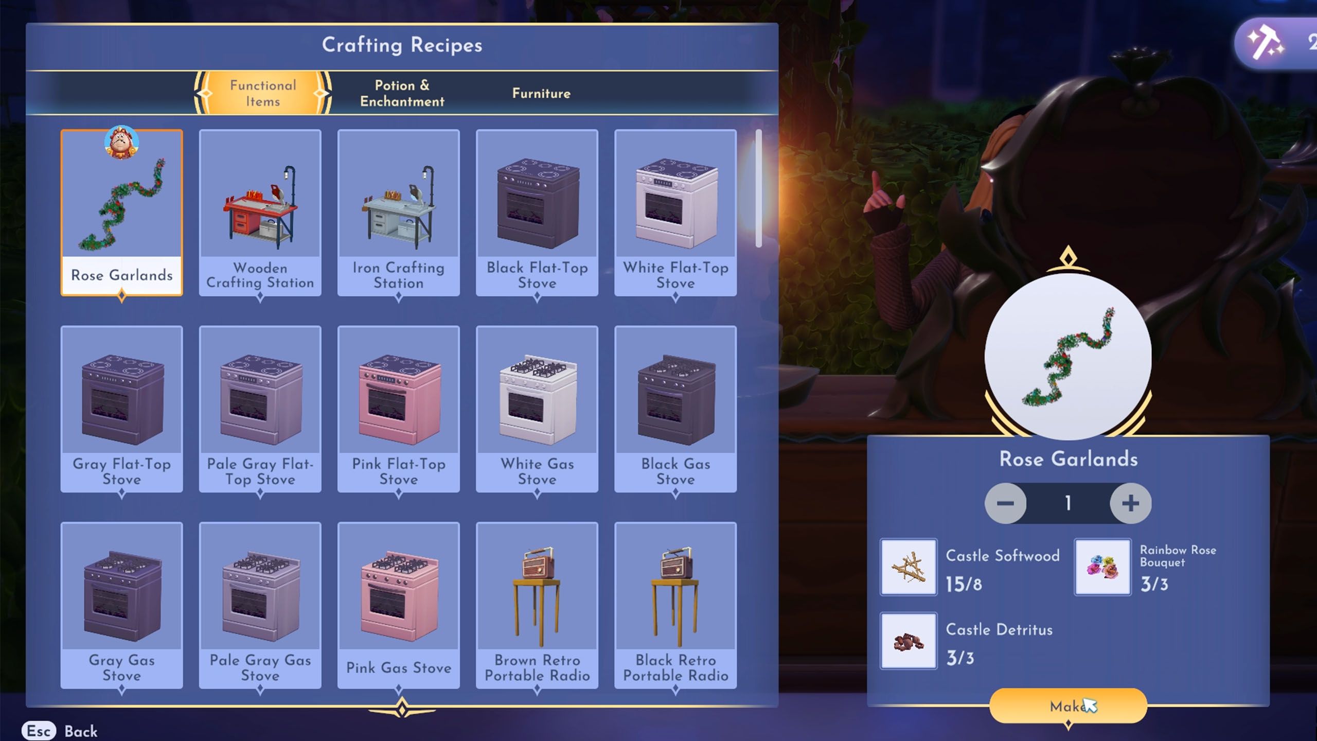 Create the Rose Garlands and use them to decorate the columns around the piano. With everything prepared for the ball, put on the Masquerade Mask and pose for a photo with Lumiere and Cogsworth.