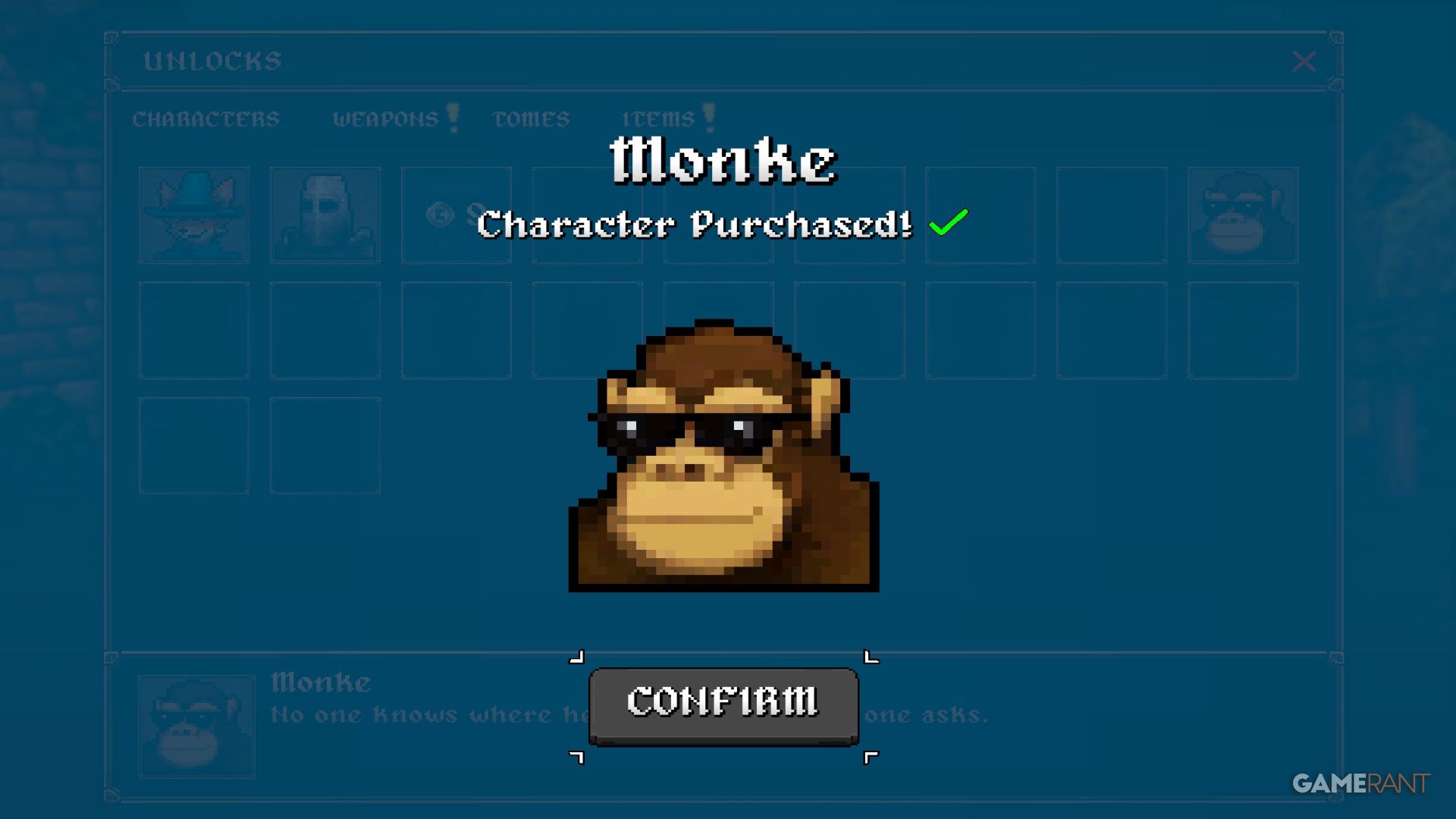 Once you’ve met the necessary conditions, you can return to the unlock screen in the main menu and buy Monke for 18 coins.