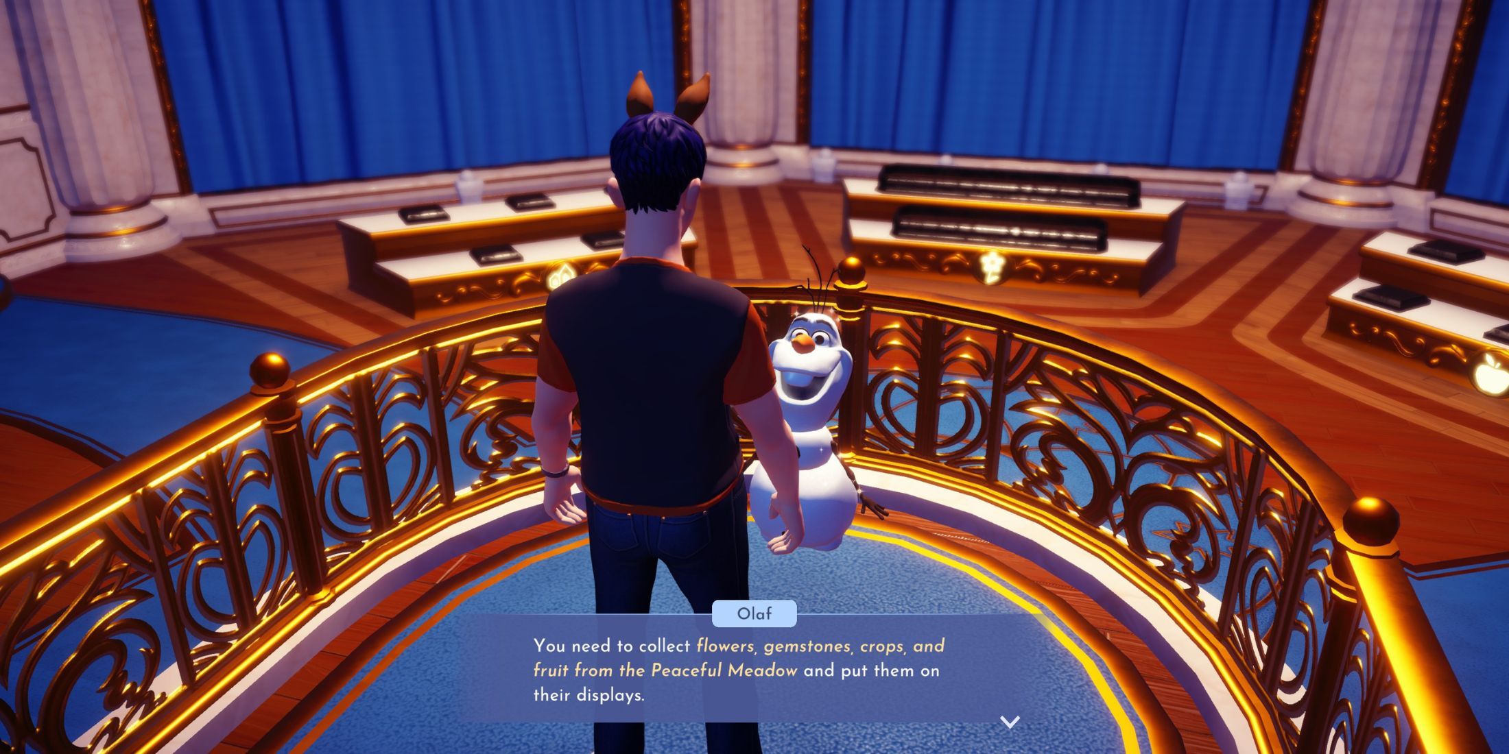 - Once that’s done, Dreamers will need to go inside and speak with Olaf again. He will explain that the museum has separate rooms for each biome and ask you to follow him over to the Peaceful Meadow room to get started.