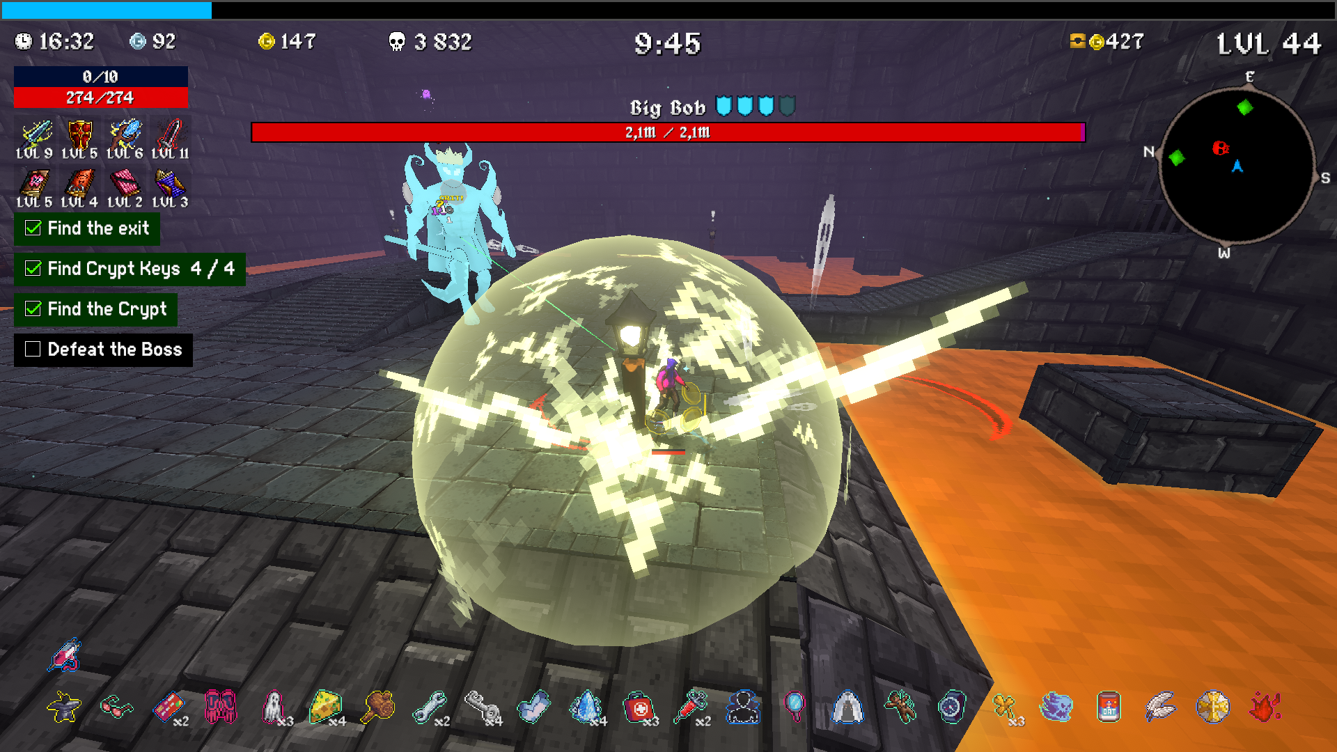 In Megabonk, players can obtain the Scythe by defeating Big Bob, the boss of the Graveyard level. To find Big Bob, you’ll need to leave the Crypt and explore the Graveyard. While there, you must collect four keys to unlock the way back. It’s important to make the most of your time in the Graveyard, as the enemies are stronger than those in the Forest and Desert, making it harder to reach the boss. Although 16 minutes might seem like enough time to level up, the increased difficulty of the enemies presents a significant challenge.
