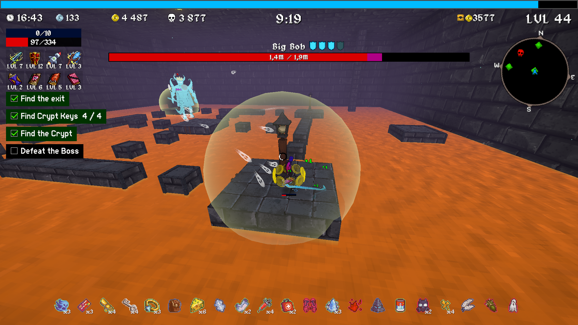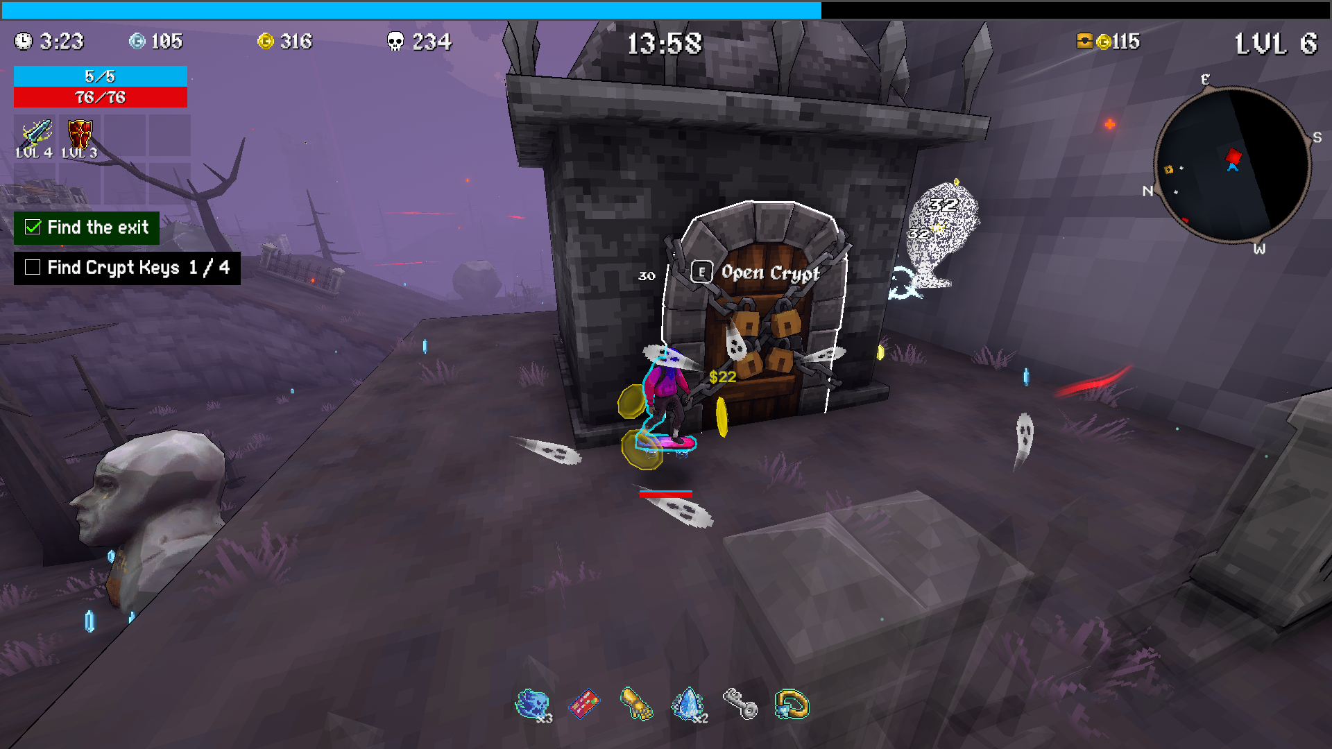 In Megabonk, players can obtain the Scythe by defeating Big Bob, the boss of the Graveyard level. To find Big Bob, you’ll need to leave the Crypt and explore the Graveyard. While there, you must collect four keys to unlock the way back. It’s important to make the most of your time in the Graveyard, as the enemies are stronger than those in the Forest and Desert, making it harder to reach the boss. Although 16 minutes might seem like enough time to level up, the increased difficulty of the enemies presents a significant challenge.