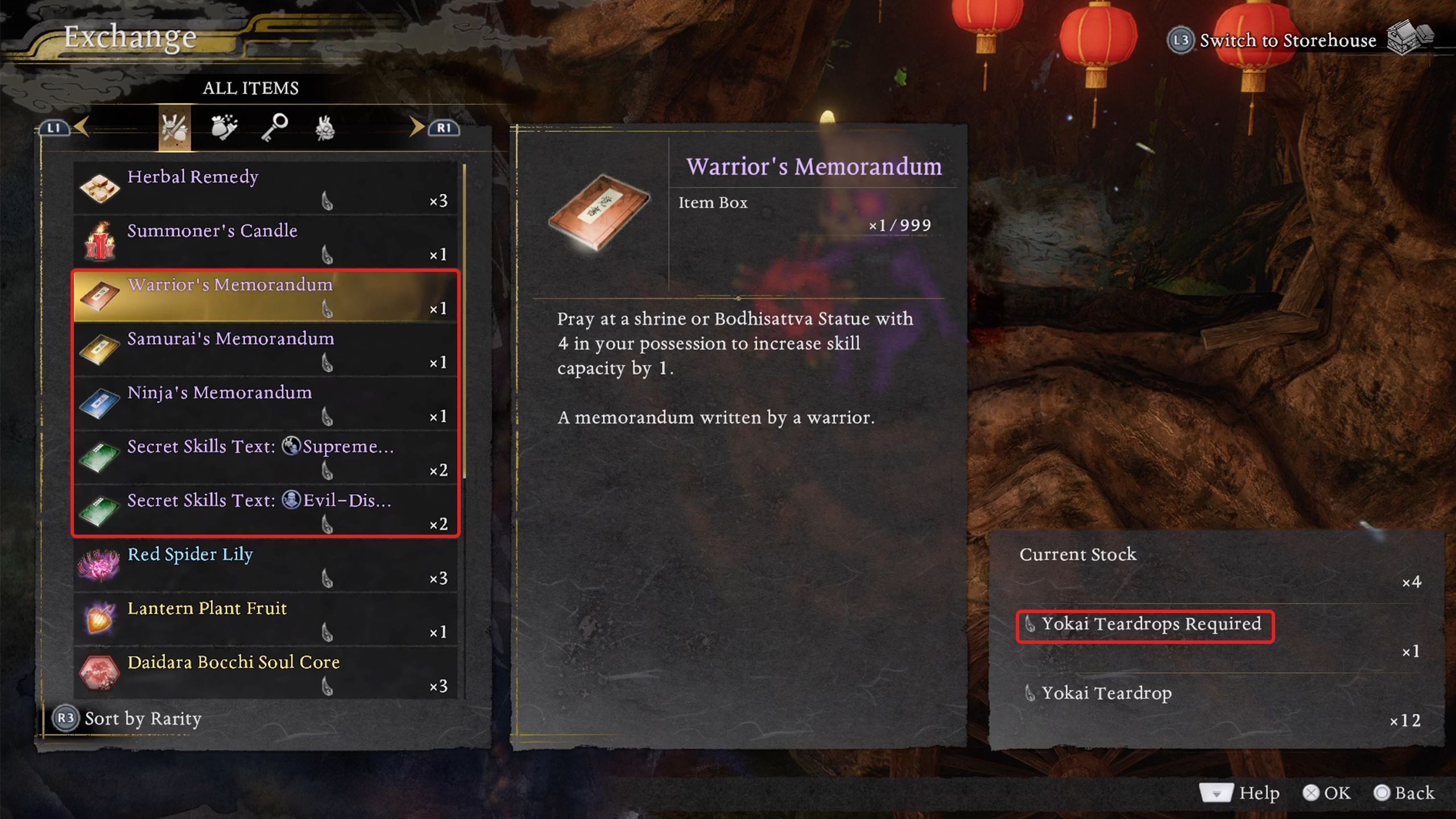 You can consistently obtain Memorandums by trading Yokai Teardrops with the shopkeeper. Every four Memorandums you collect will increase your skill capacity by one. Different types of Memorandums affect different skills: Samurai and Ninja Memorandums expand the skills within their specific classes, while the Warrior Memorandum increases capacity for Common Skills.