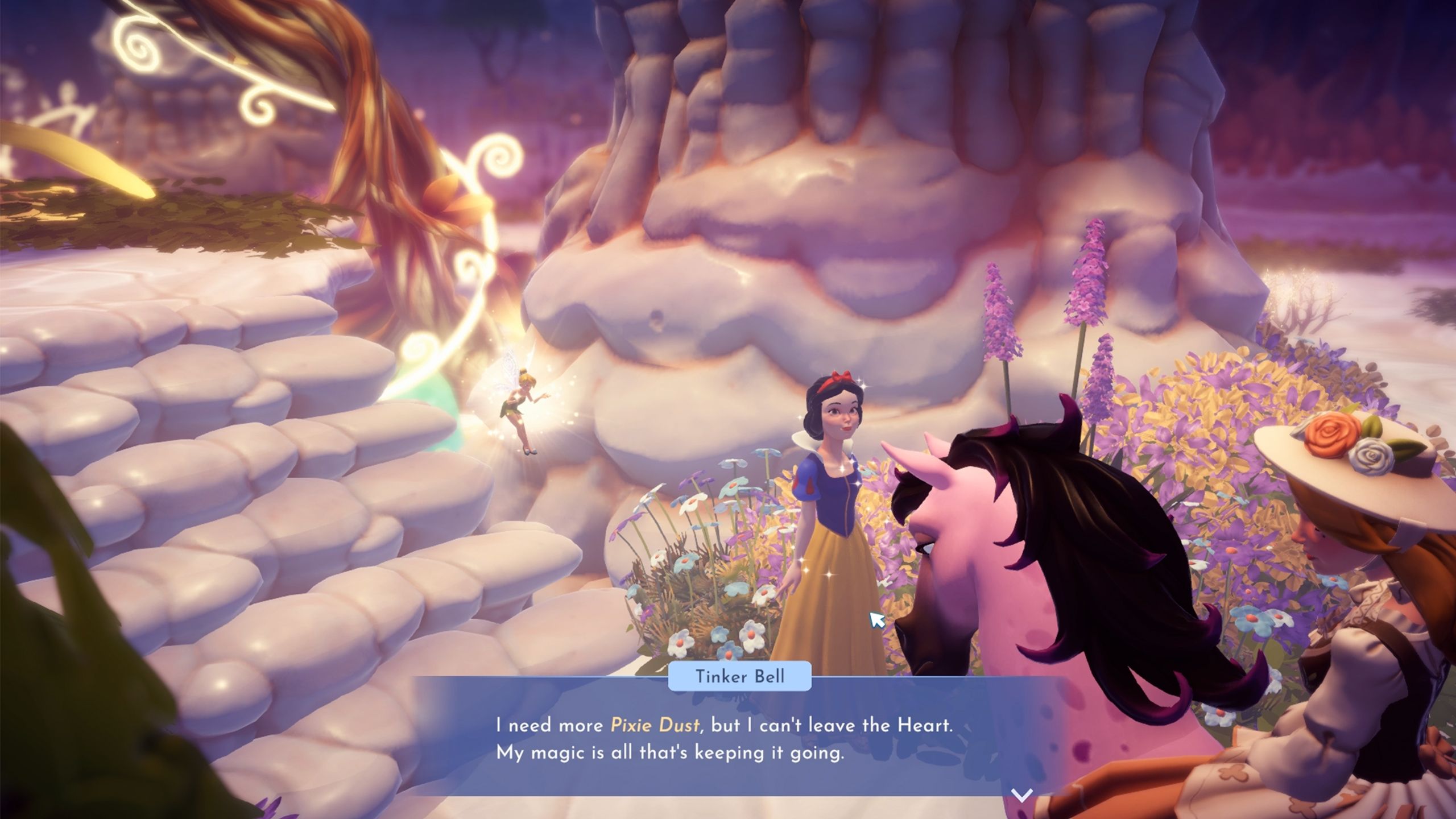 Ride your horse around the cave and defeat 10 Dead Wishblossoms. Bring the items you collect to Tinker Bell.