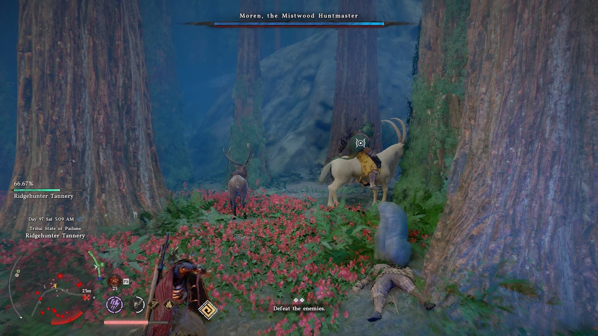 This boss fight can be challenging. You’ll face a mounted archer riding a large Ibex, and his hunter tribe controls the area, so they’ll probably interfere. Moren will be wandering around the quest marker’s location. He’s hard to miss because of his mount’s size, but you can also track him by using your lantern to follow the yellow lines that appear as you move.