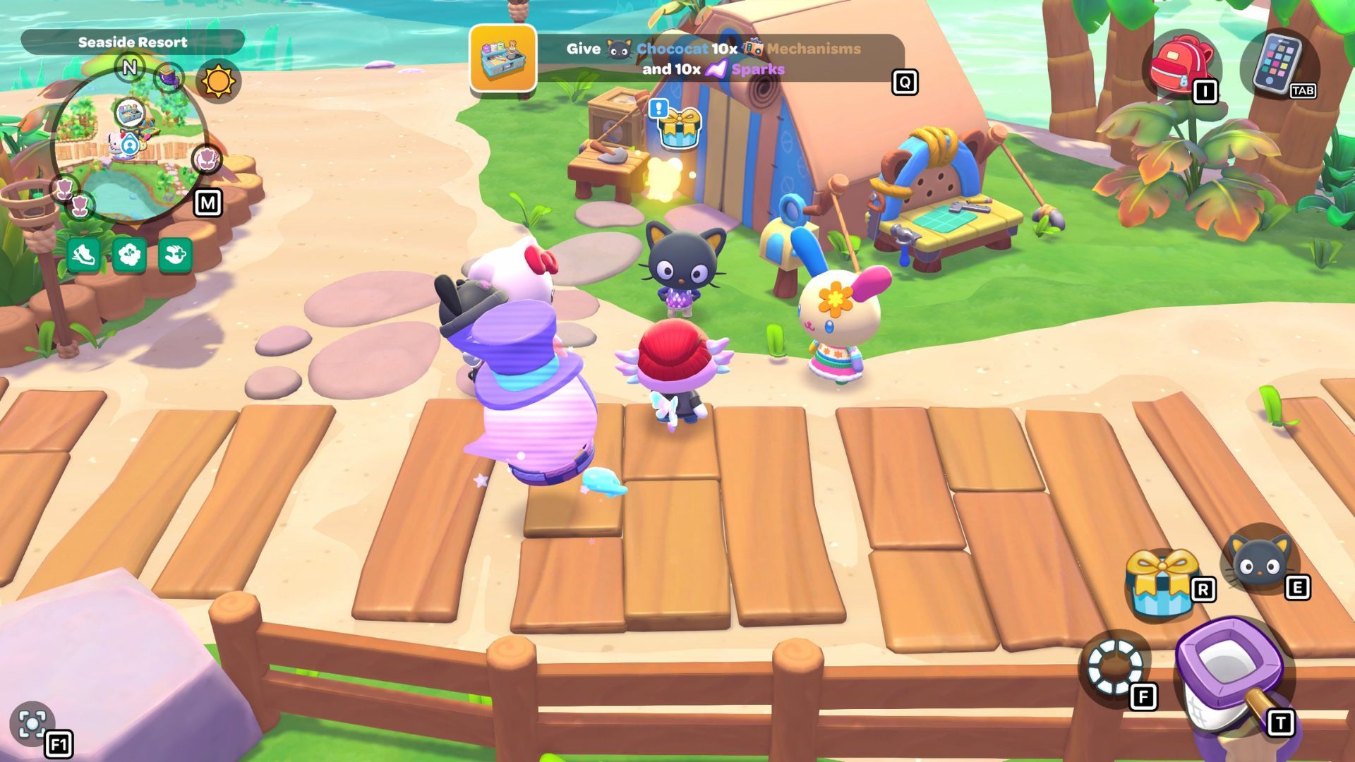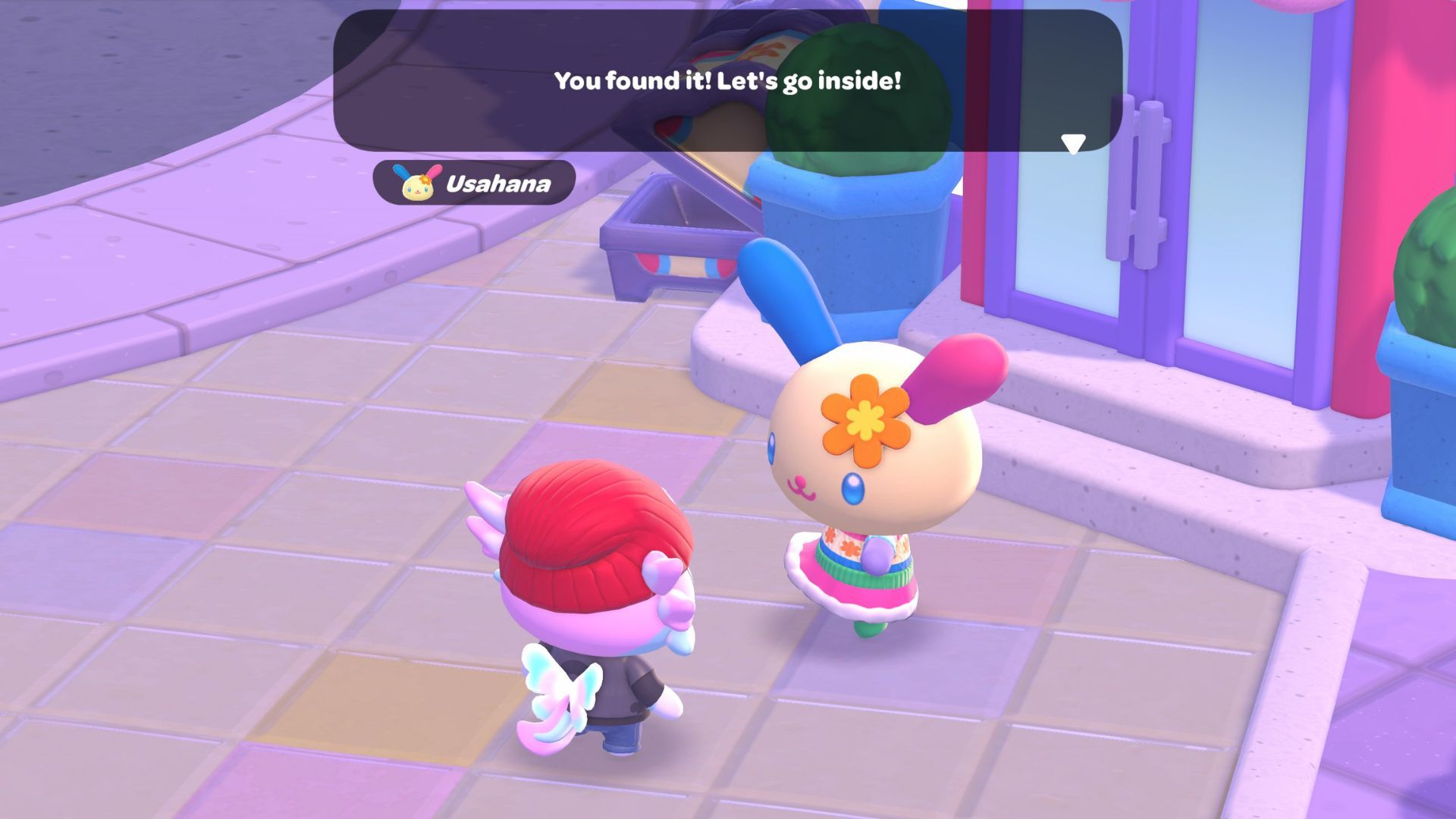 You can find Usahana at the Resort Plaza, near the Hello Kitty, My Melody, and Tuxedosam statues. Chat with Hello Kitty – she’ll greet Usahana and welcome them to Friendship Island. Then, Hello Kitty will invite Usahana to her cafe for a treat, so be sure to follow them!