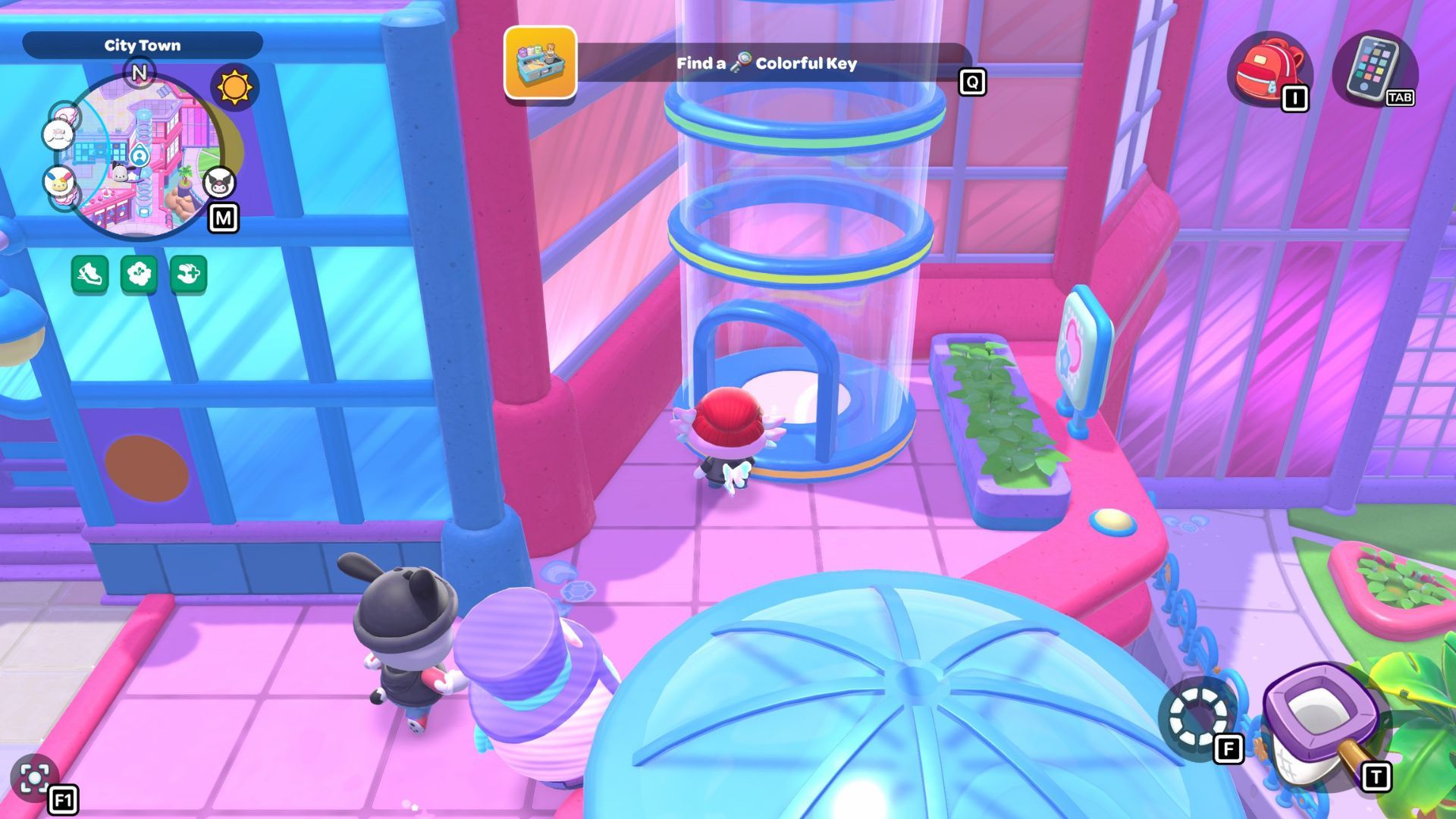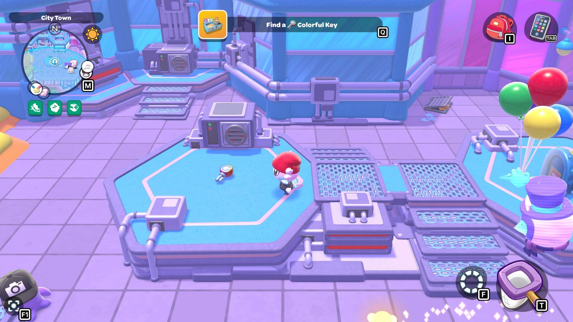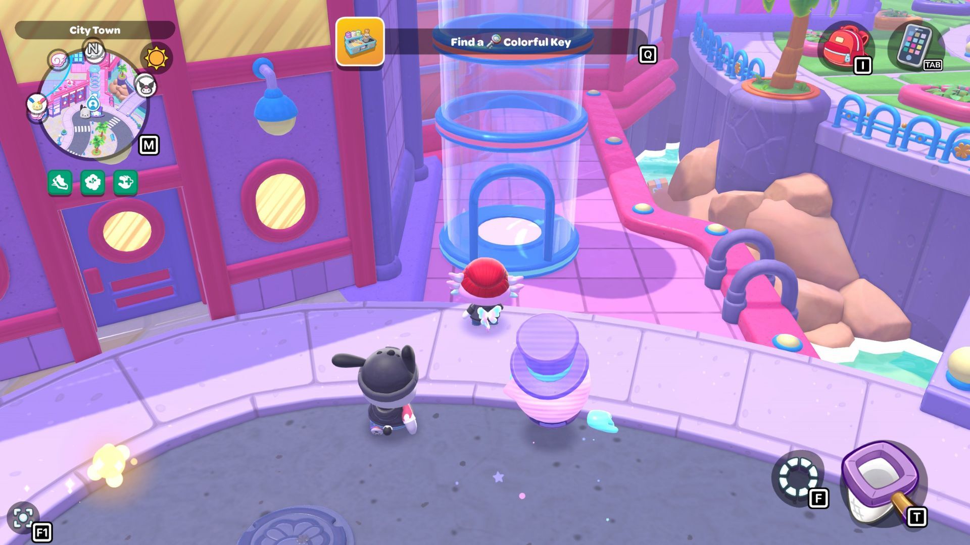 To find the Colorful Key, head to the rooftops above the Imagination Cafe. The easiest way to get there is by taking the glass elevator on the right side of town. You’ll find it between a purple building and the bridge to City Critter Park. The elevator will take you up to the roof of the purple building.