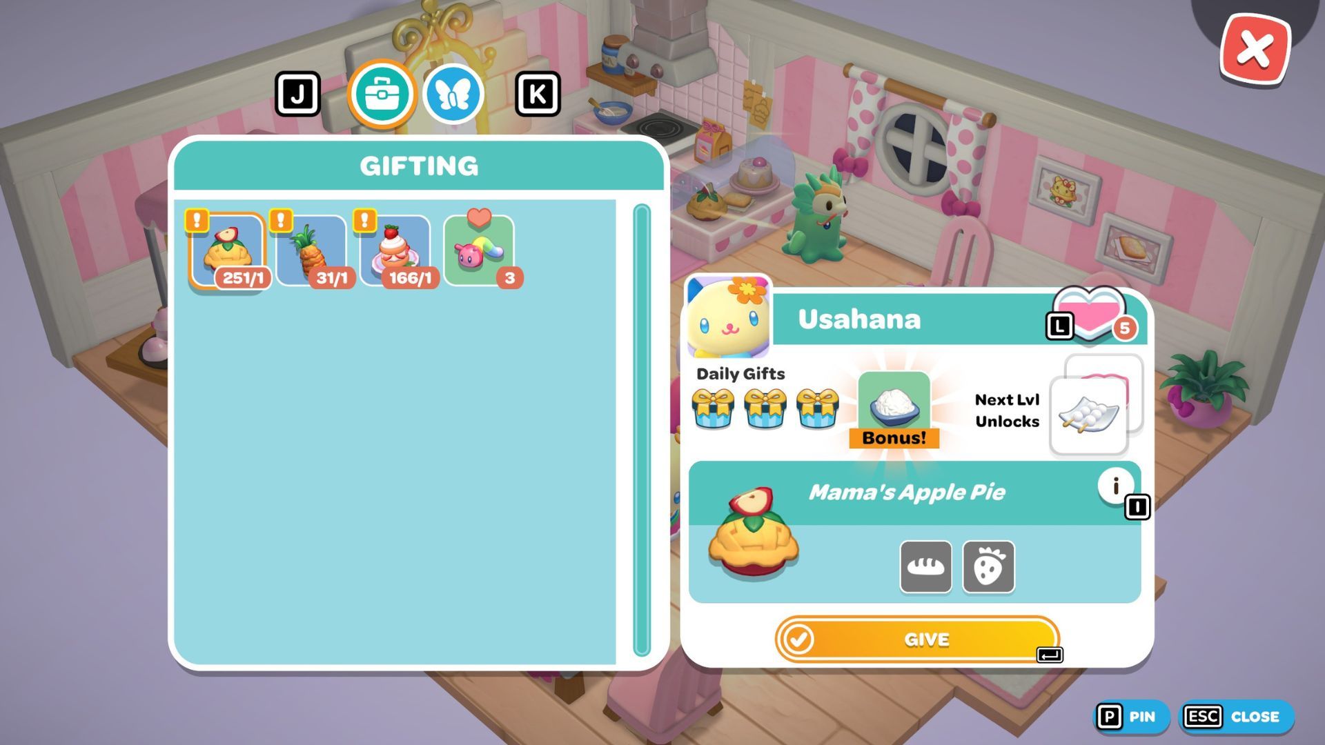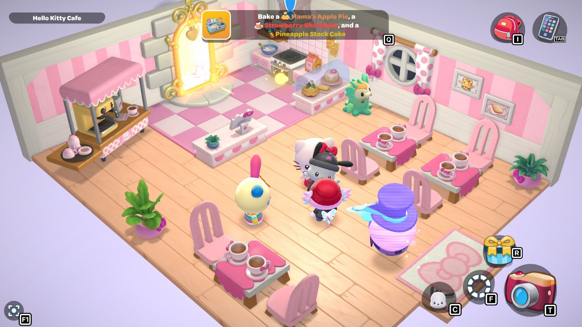 At the cafe, you’ll need to bake three treats for Usahana: Mama’s Apple Pie, Pineapple Stack Cake, and Strawberry Shortcake. Use the cafe’s oven to bake everything, and then give the desserts to Usahana. Once you’ve done that, the three of you will go to Chococat’s house.