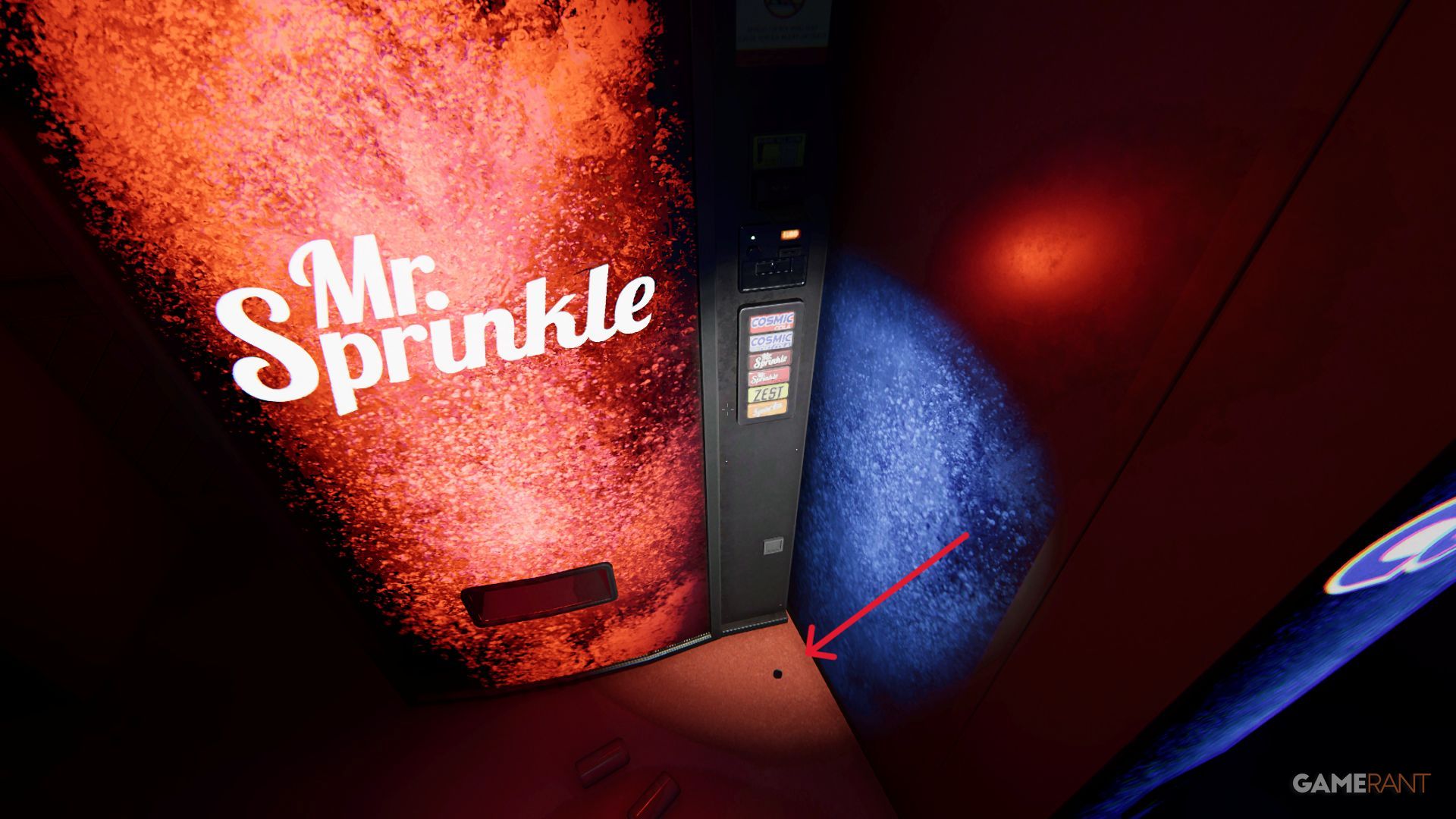 Insert the card into the ATM by pressing the ‘F’ key, and then take the dollar bill that is dispensed. Turn around and insert the dollar bill into the Mr. Sprinkle vending machine. A coin will fall to the floor, so pick it up.
