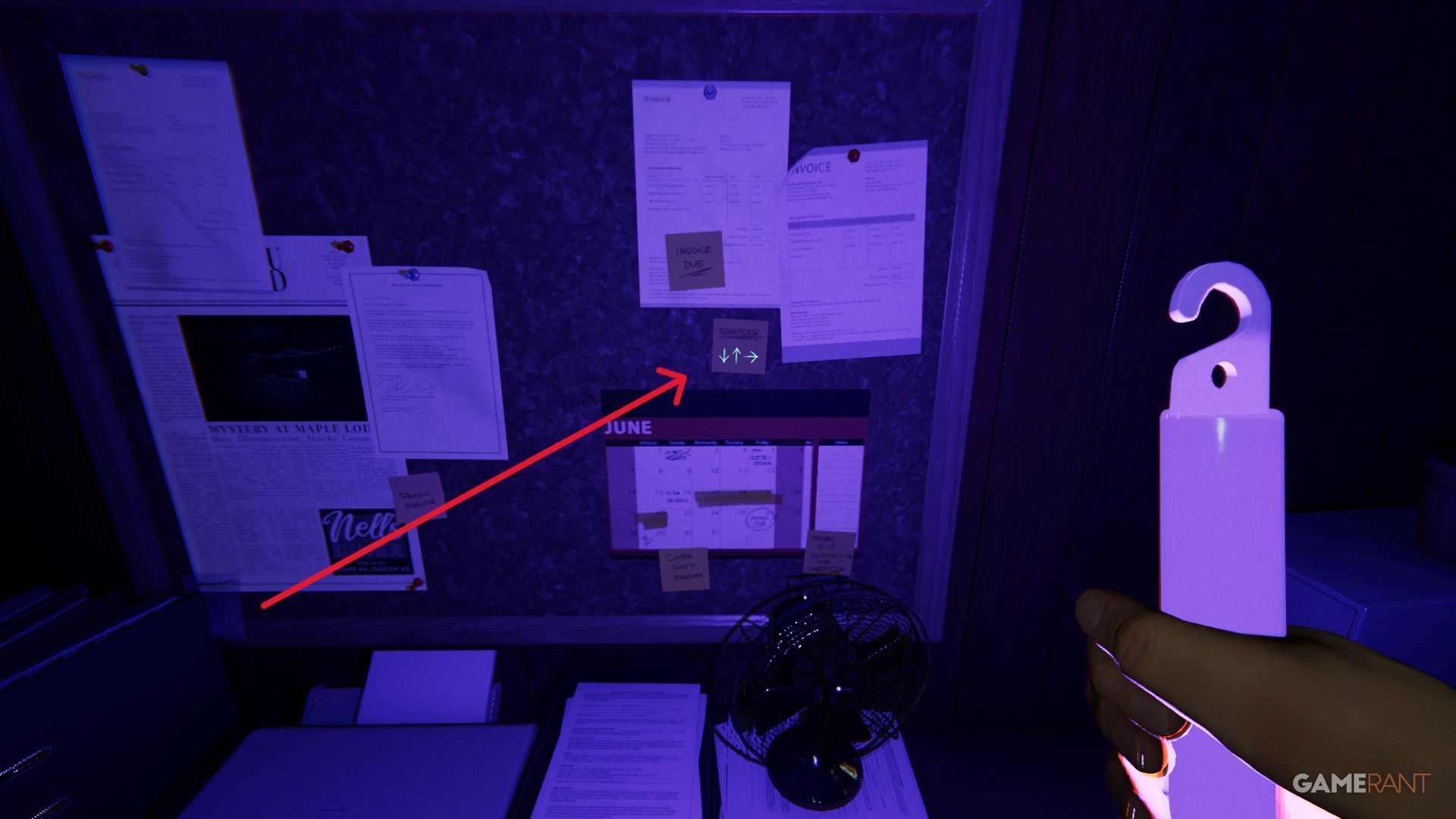 There’s a Post-it board hanging above the safe. Shine a UV light on one of the notes to see three hidden arrows: one pointing down, one up, and one to the right.