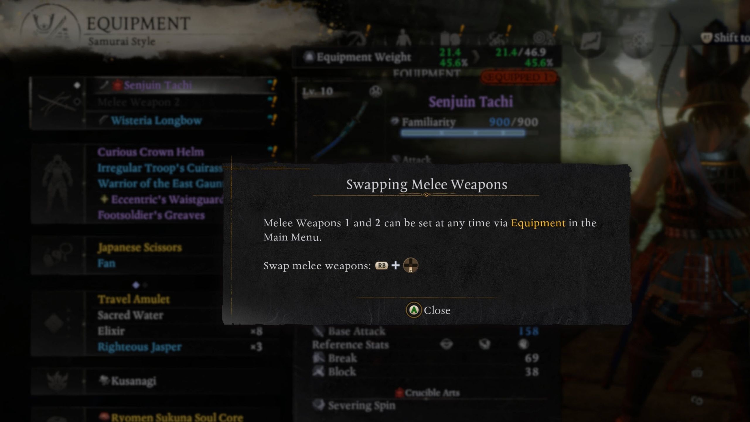 If you have two close-combat weapons, you can quickly switch between them using RB/R1 + Down on the D-Pad with a controller, or by pressing Tab on the keyboard. This is especially helpful when fighting enemies with different weaknesses, as it lets you change weapons without constantly opening the equipment menu.