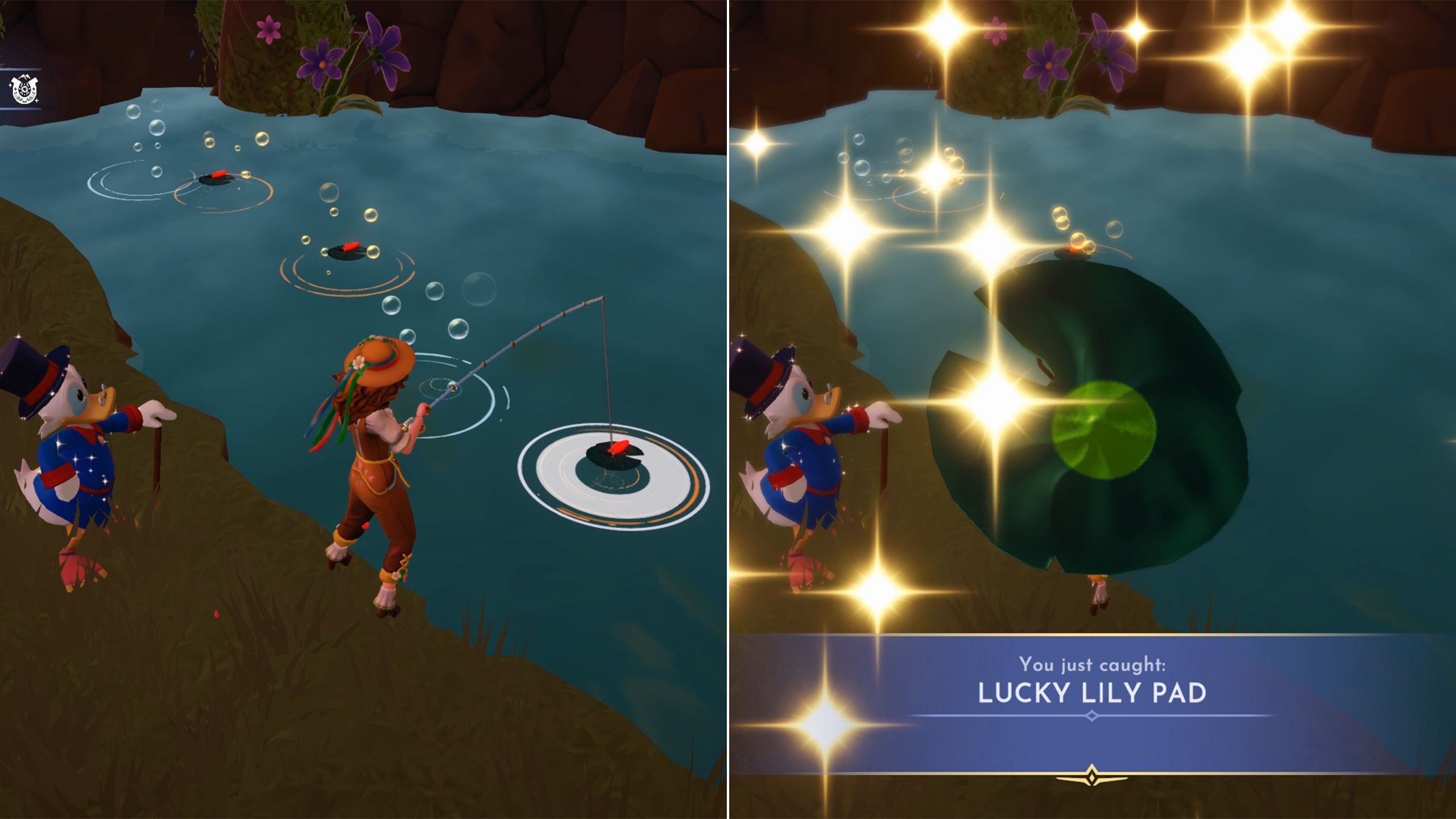 Okay, so I headed over to the northern pond to try and complete the Catch the Lucky Lily Pad quest. The note I found said my lucky number is three, and there were six golden ripples on the water. Following the instructions, I cast my Fishing Rod into the third ripple, and boom – I caught the Lucky Lily Pad in DDV! Now I just need to head over to the prize stand and collect my tickets.