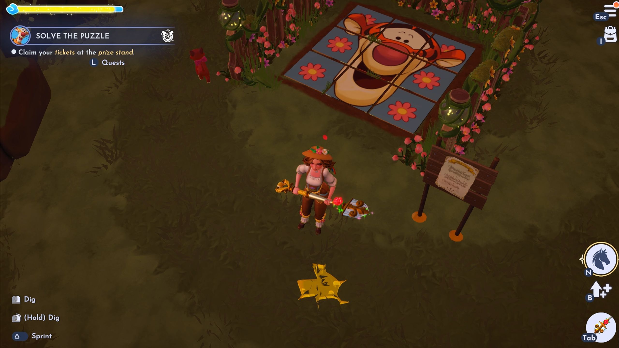 Head back to where the puzzle is and put the missing tile in place. To complete the puzzle in Disney Dreamlight Valley, use your shovel to flip all the tiles so the blue side faces up, recreating the pattern of Tigger’s stripes. Once finished, collect your tickets from the prize stand.