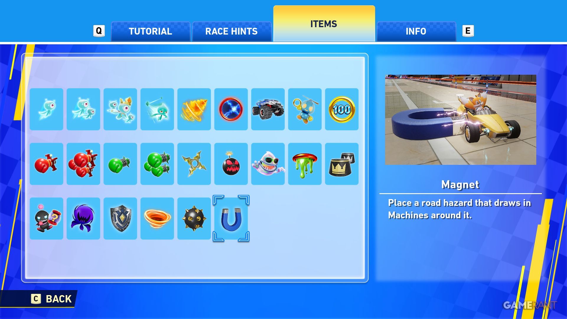 - Sucks in Rings and item boxes from a distance. Negates some item attacks and course obstacles.