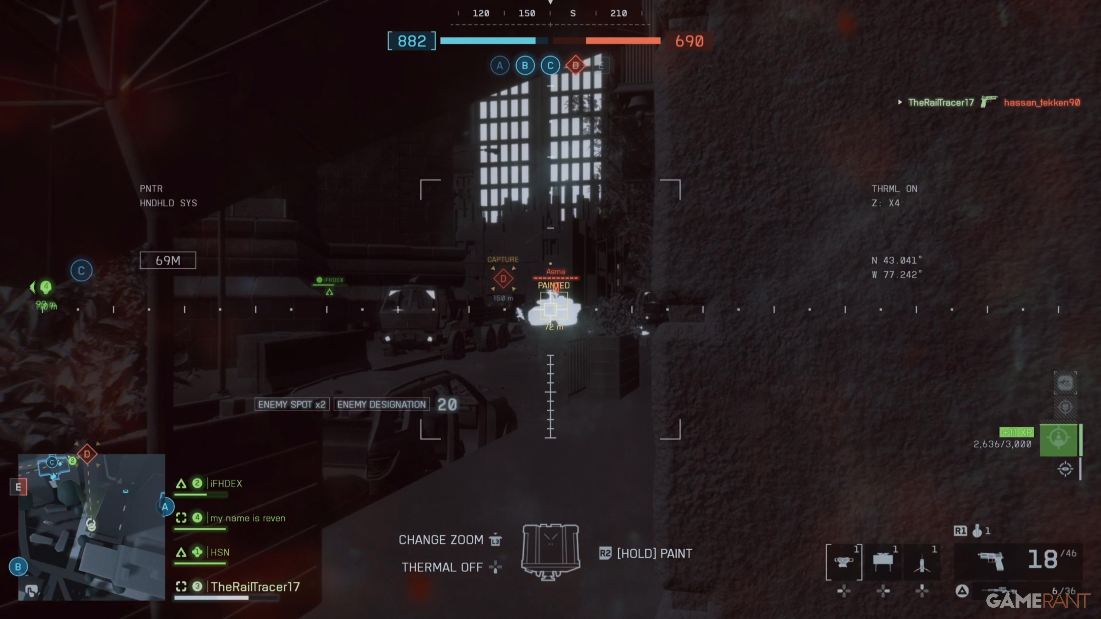The Laser Designator Gadget functions like binoculars for Recon players. At the start of a match, use the left d-pad on your controller or the “3” key on your keyboard to activate them. You’ll then have the choice to zoom in or set up a tripod. Zooming activates thermal vision, letting you see heat signatures. While you can turn thermal vision off, it’s generally more helpful to leave it on, as it makes it easier to find enemies and vehicles.