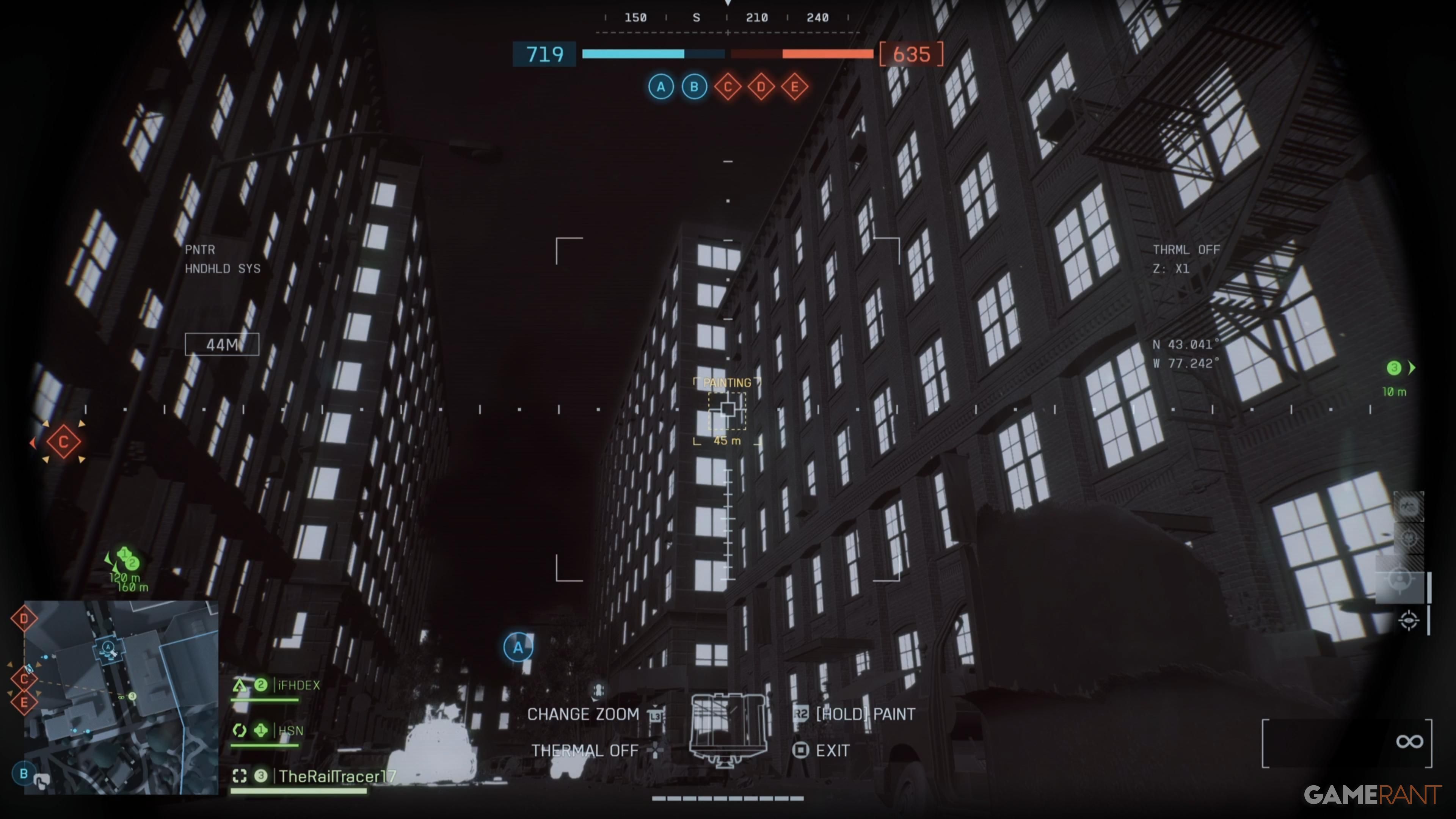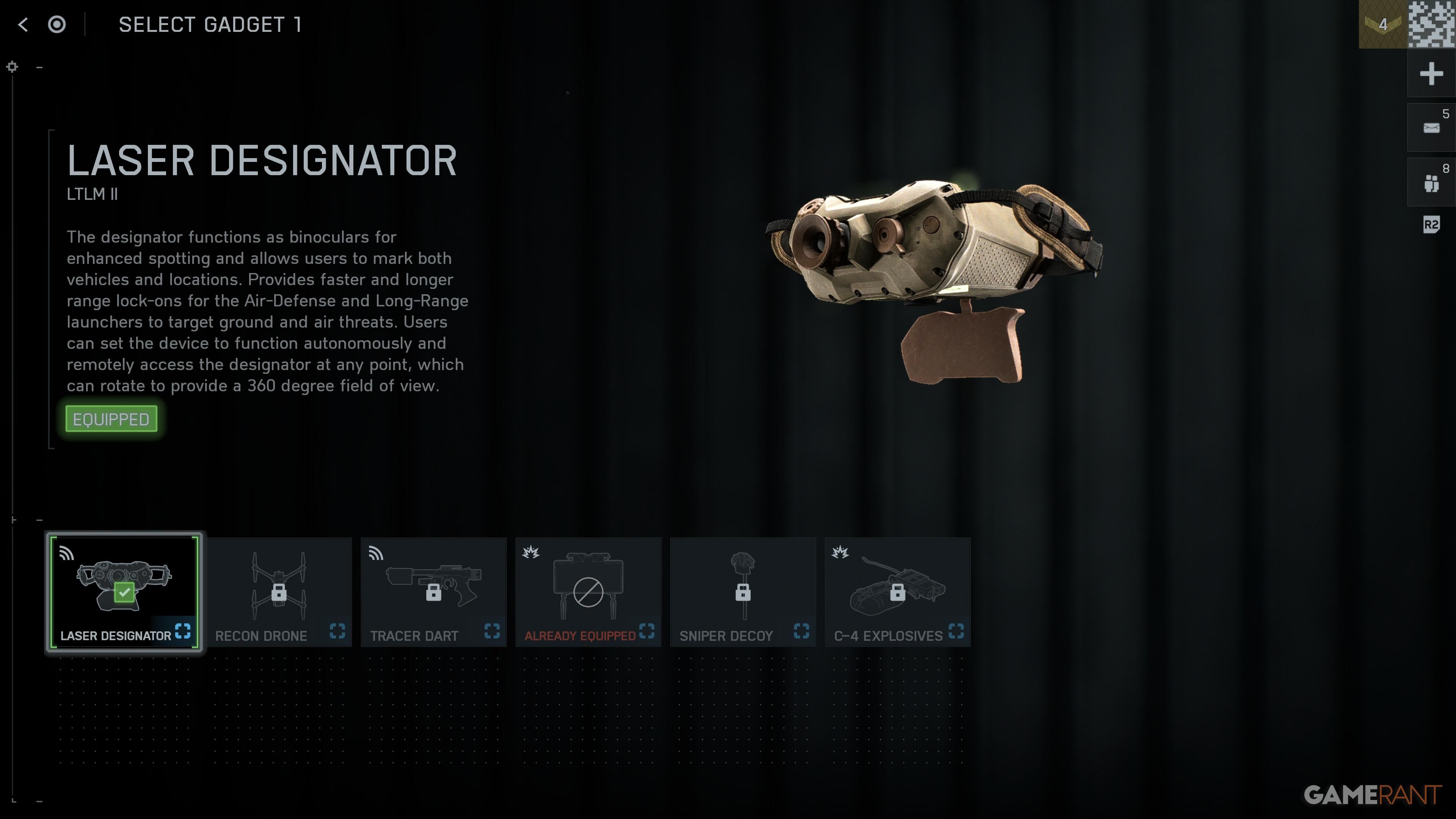 The Laser Designator Gadget functions like binoculars for Recon players. At the start of a match, use the left d-pad on your controller or the “3” key on your keyboard to activate them. You’ll then have the choice to zoom in or set up a tripod. Zooming activates thermal vision, letting you see heat signatures. While you can turn thermal vision off, it’s generally more helpful to leave it on, as it makes it easier to find enemies and vehicles.
