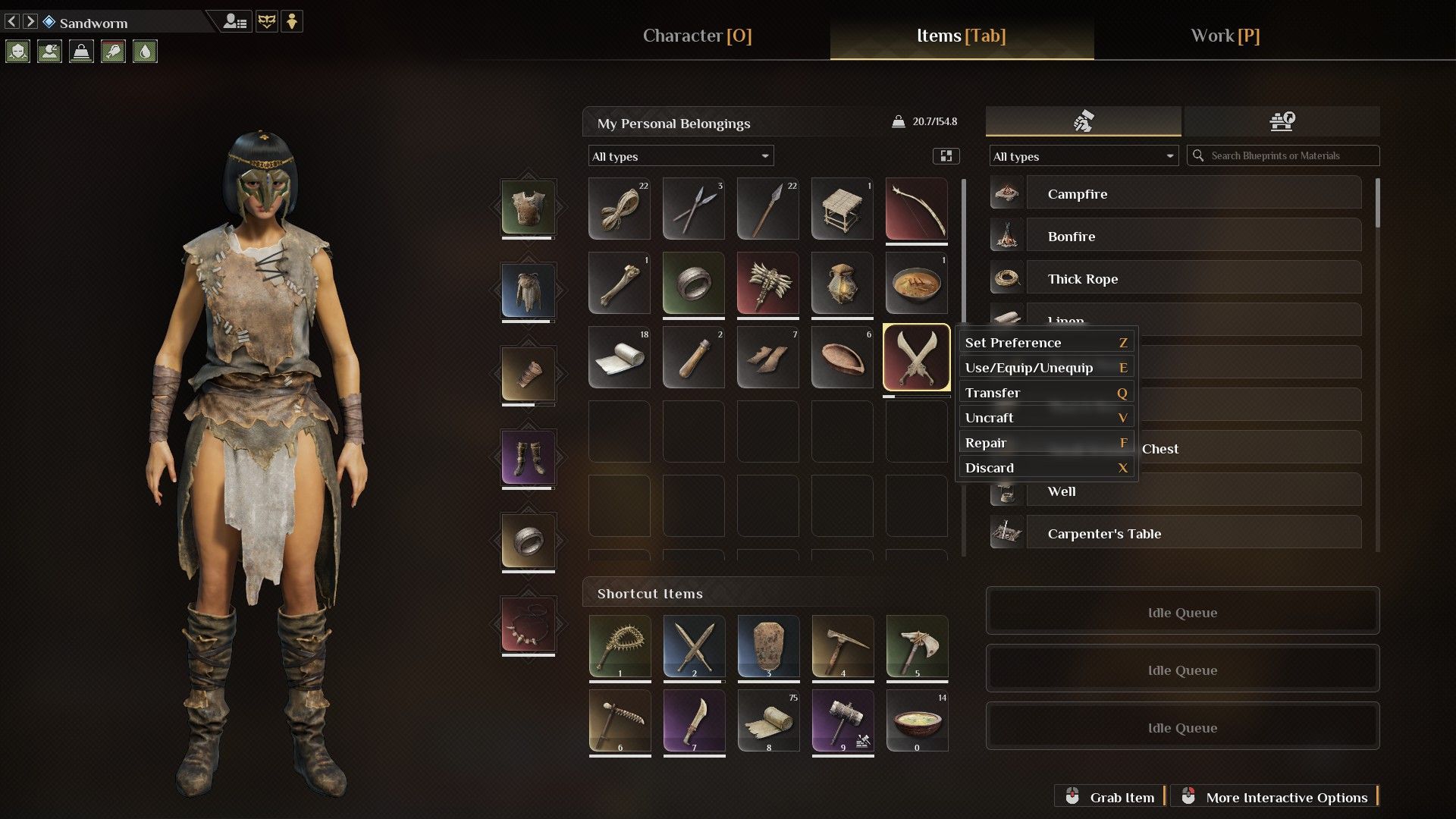 You can easily fix simple equipment made from wood, stone, or bone directly in your inventory. Just right-click the item and choose ‘Repair’. You’ll need the necessary materials, but if you’re near your Bonfire, those materials will be automatically taken from any storage containers nearby, saving you a trip!