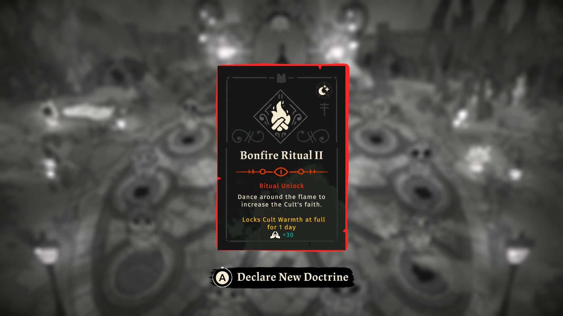 Yngya will later improve the Bonfire Ritual so that the Cult Warmth bonus lasts for a full day. This is really useful if you’re trying to gather Rotburn or can’t consistently manage your flock.