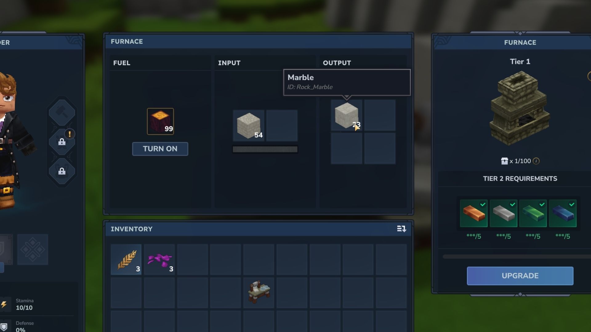 To get Marble, place Marble Cobble in the top slot of a Furnace, add fuel, and turn it on. You’ll get 1 Marble for every 2 Marble Cobble you use.
