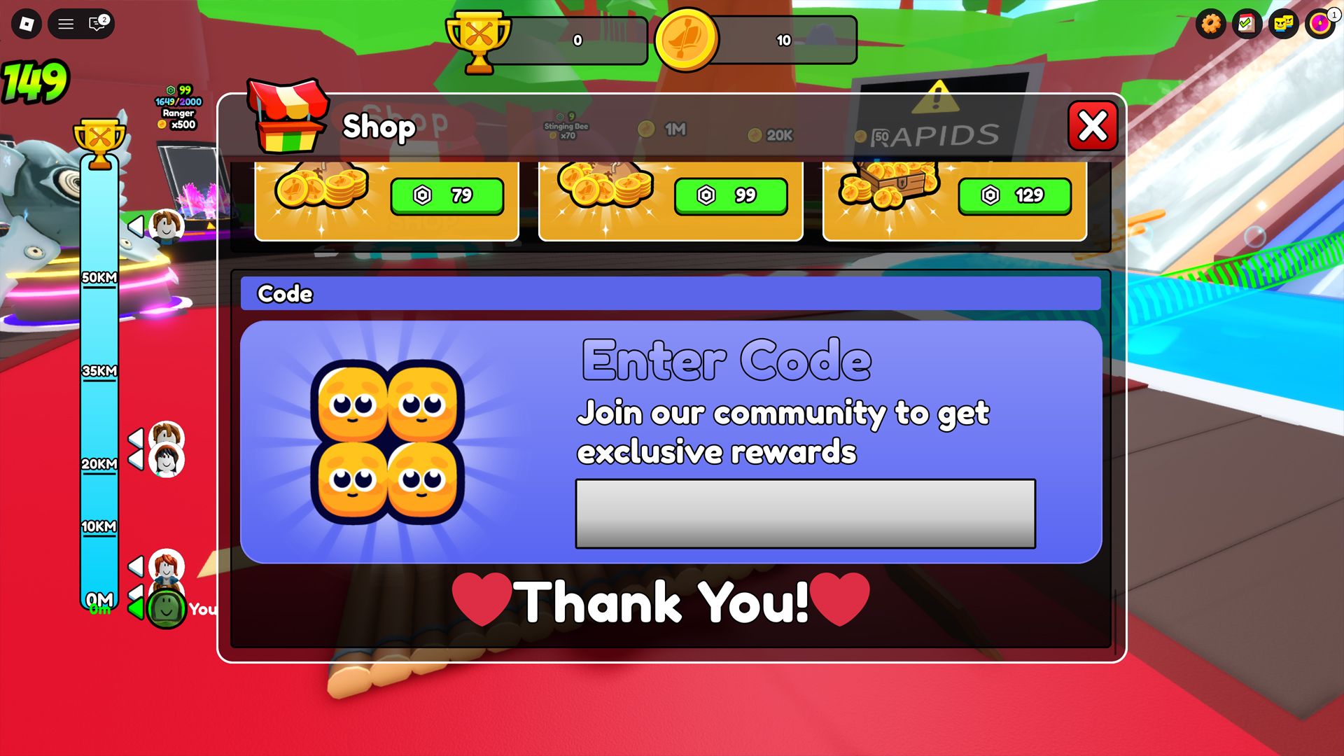 Redeeming codes in Kayak and Surf is easy, just like in most Roblox games. Open the Shop menu and scroll to the bottom where you’ll find a box to enter codes. Simply type or paste a code from the list above into the box and press Enter to claim your reward.